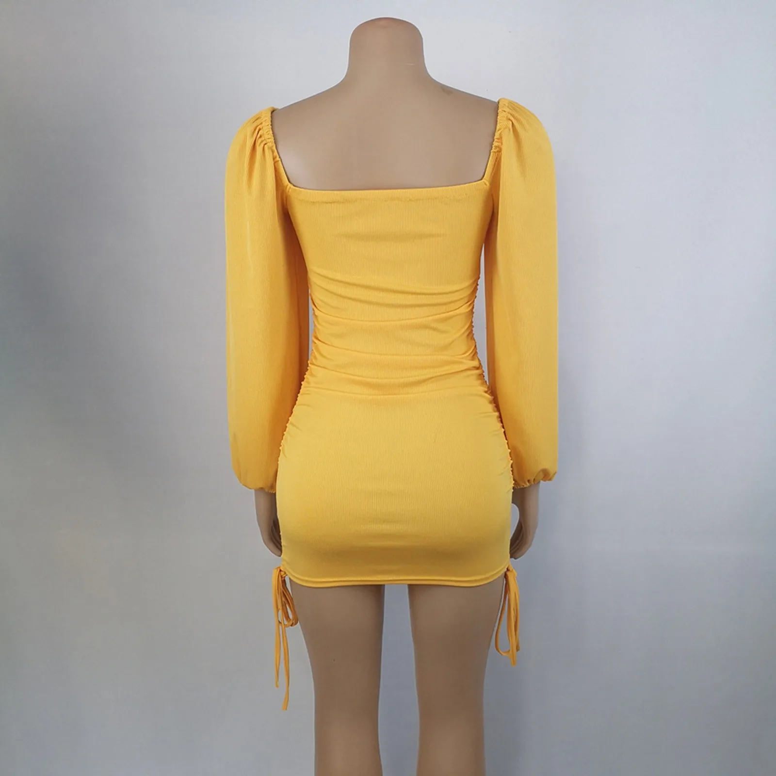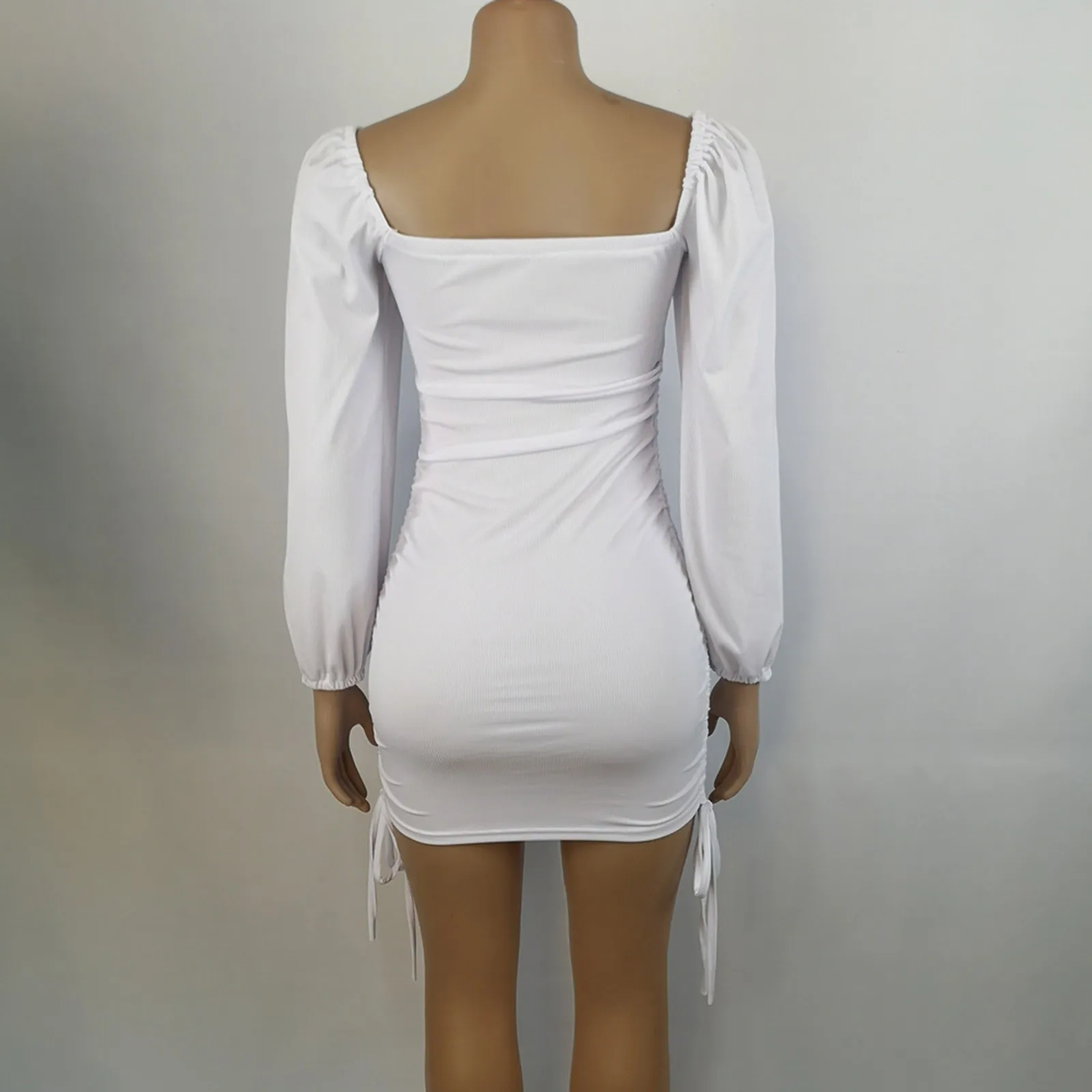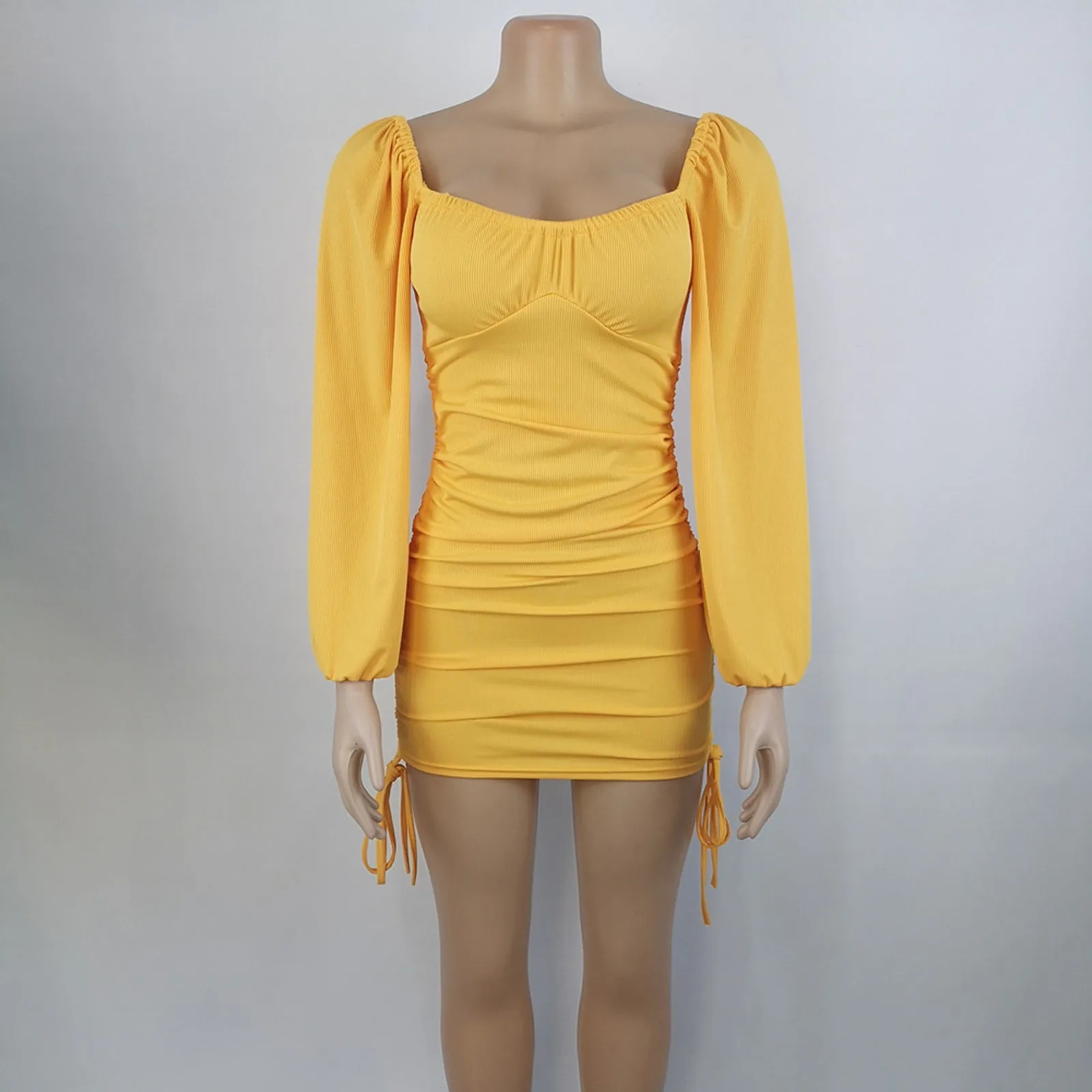 Особенности:Застежка на шнурке,Пышное Платье с длинными рукавами, низким квадратным вырезом, выше колена, со сборками по бокам, короткое платье с высокой талией, клубное мини-платье с рюшами спереди