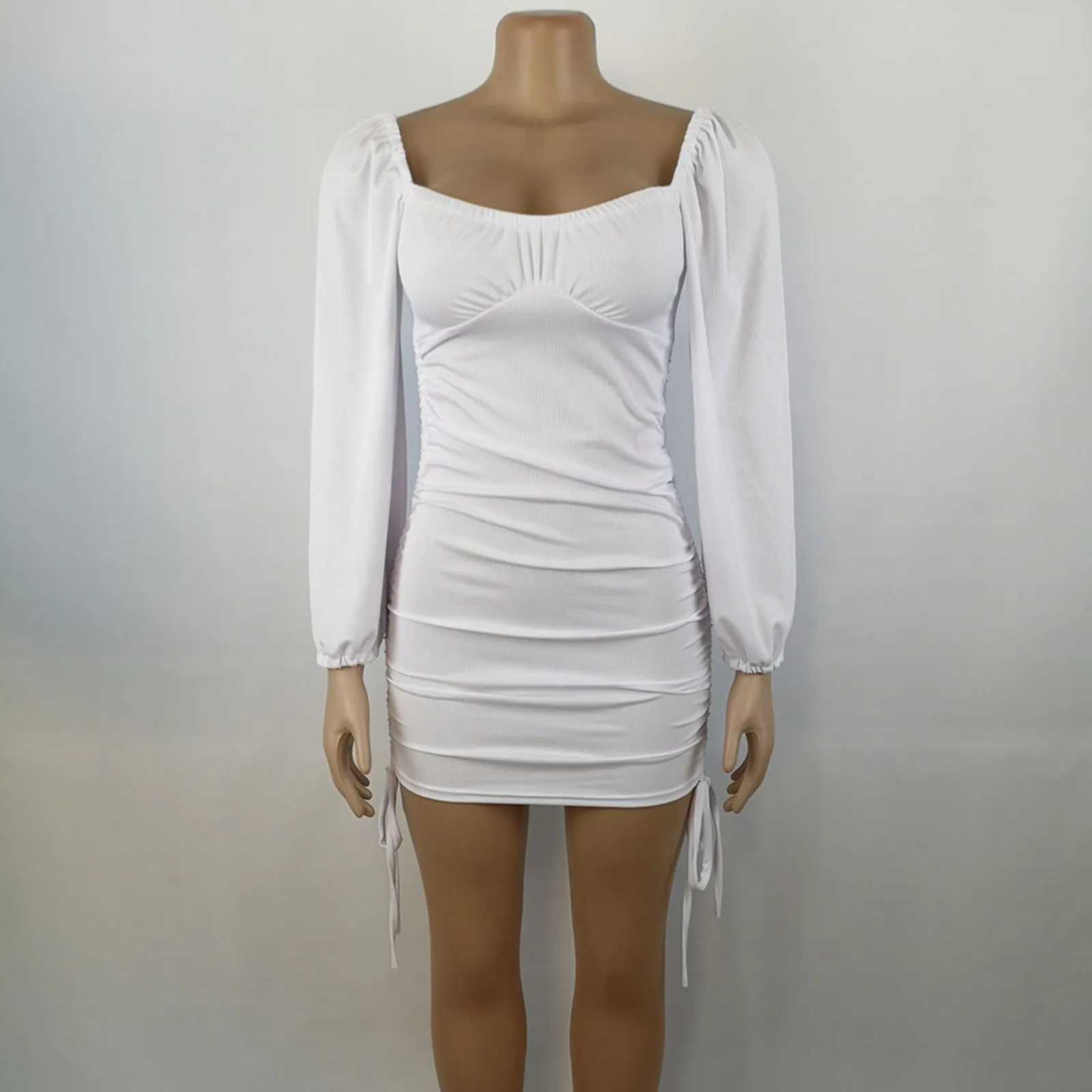 Женские платья 2021, облегающее белое платье с длинным рукавом-фонариком и кулиской, однотонное мини-платье в рубчик с рюшами, платья для женщин