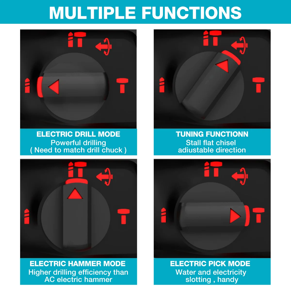 -Машина в сочетании с функциями электрического молотка и электрической дрели. Поверните переключатель для преобразования функций.