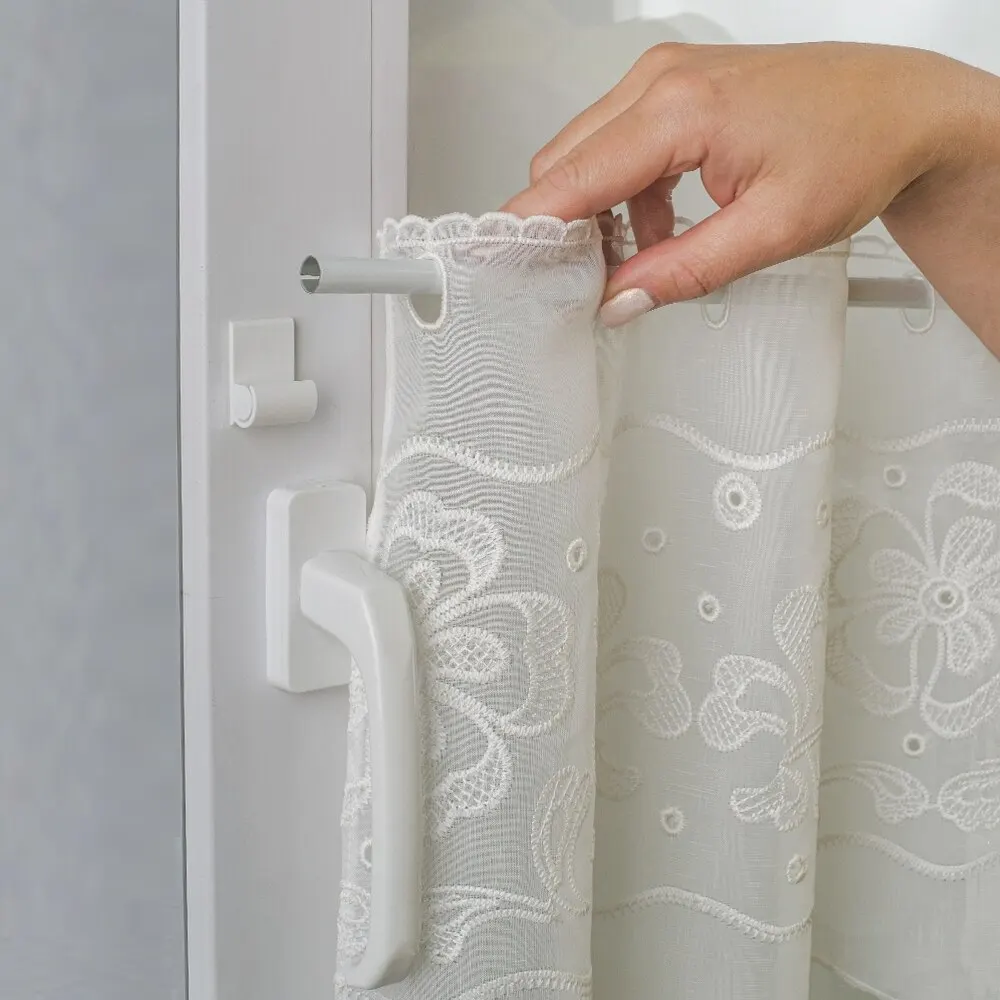 Мини-карниз представляет собой простое устройство для небольших легких занавесок и крепится на каждую створку окна с помощью двустороннего скотча.