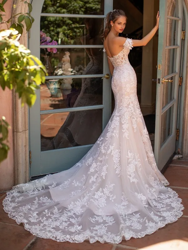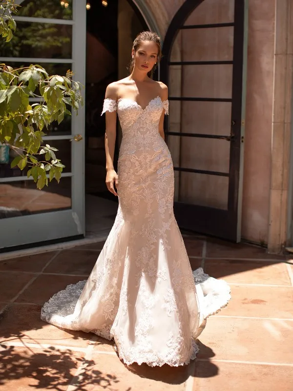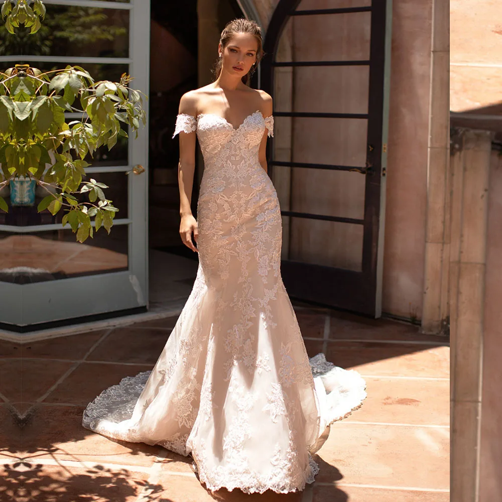 Свадебное платье с открытыми плечами и кружевной аппликацией, темно...