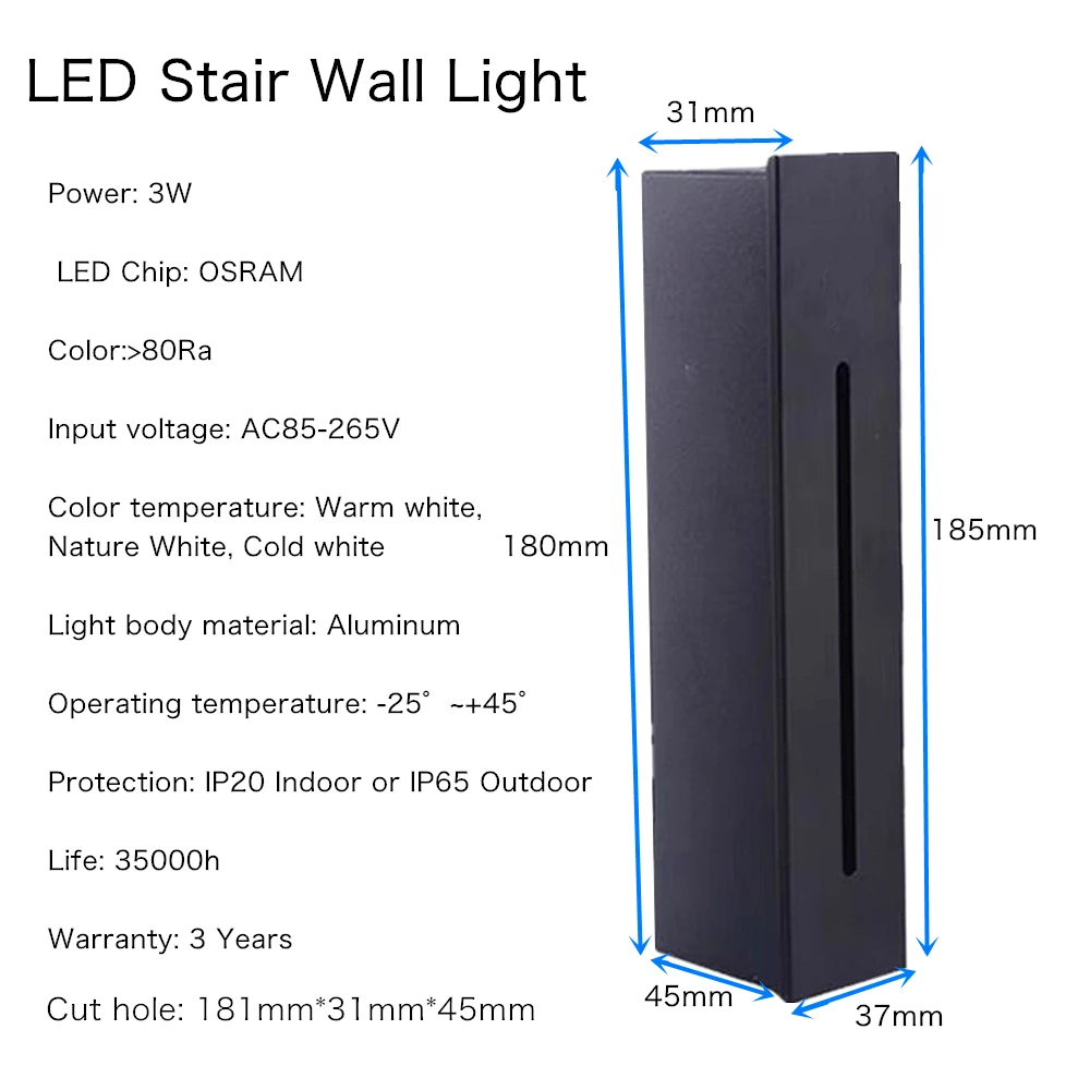 Мощность: 3 ВтВходное напряжение: AC85-265VКласс защиты: IP20 Крытый, IP65 открытыйОсновной материал: алюминийРазмер отверстия: 181 мм * 32 мм * 45 ммРабочая температура: -25 °C ~ + 45 °CГарантия; 3 года с CE и ROHSЦветовая температура: теплый белый 3000K, натуральный белый 4000k, холодный белый 6000KИспользование: наружный/закрытый настенный светильник, Домашний Светильник, угловая дорожка, лестница, ступенчатые настенные светильники