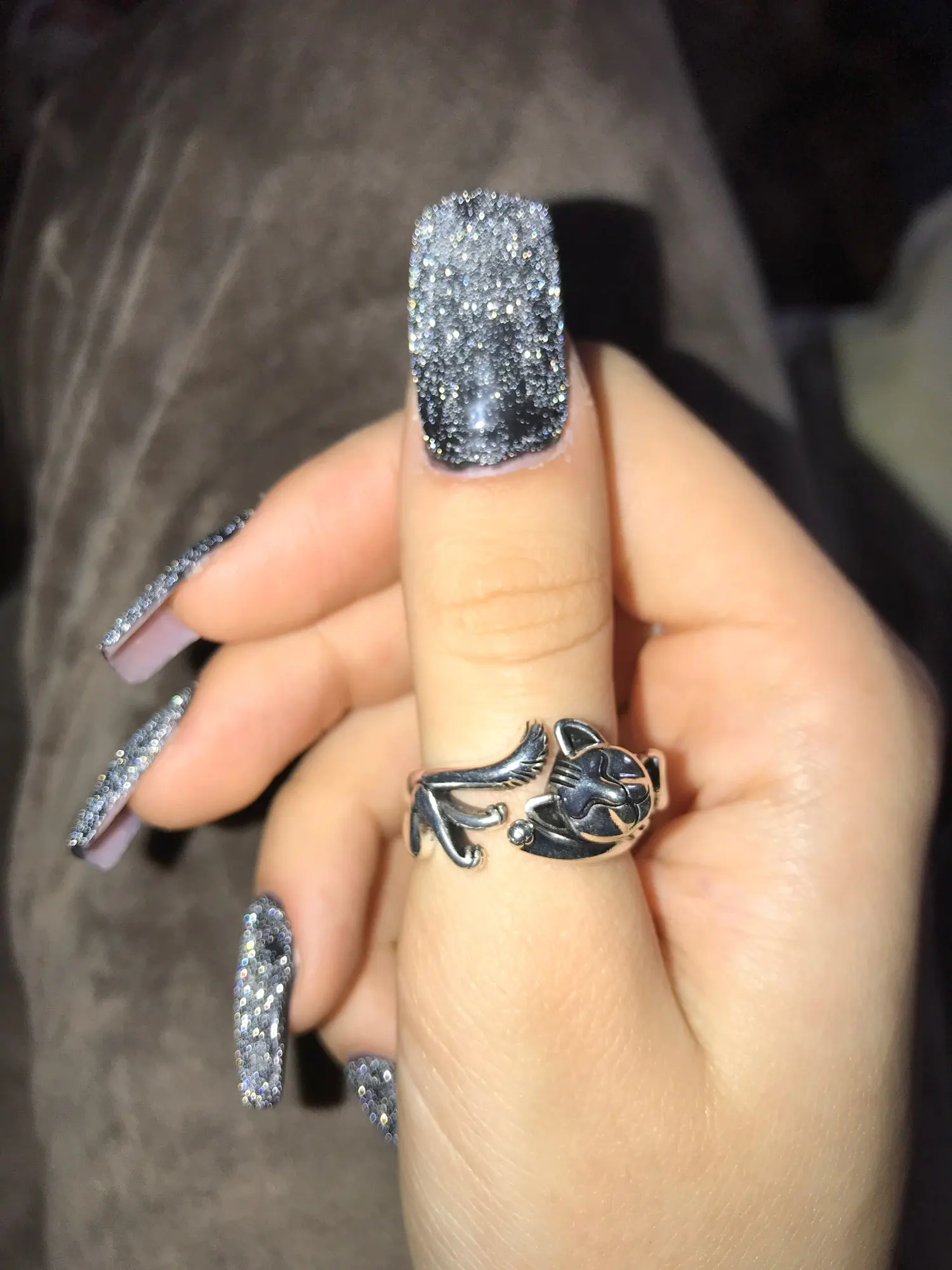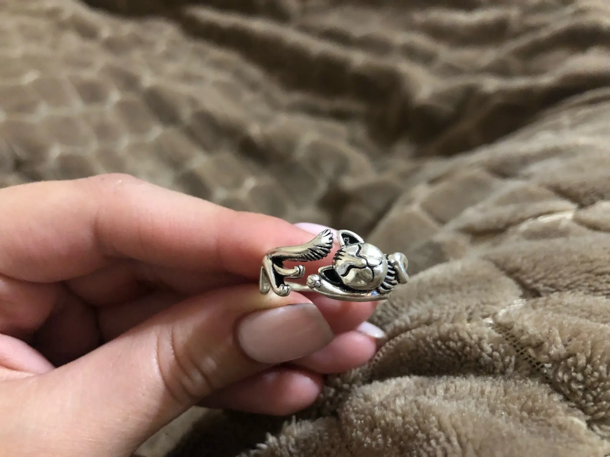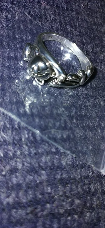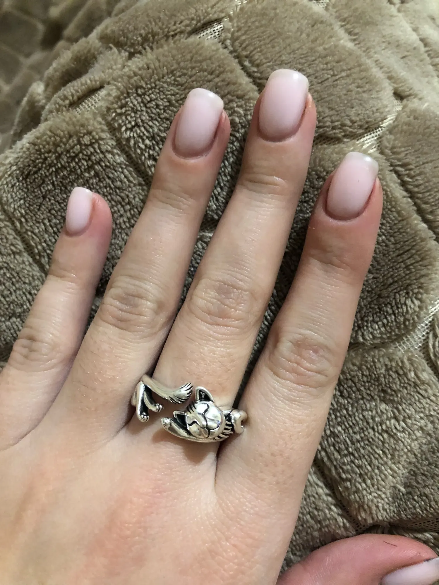 Кот не такой детальный и аккуратный, как на картинке. Серебряной пробы не увидела. Но так как кольцо досталось мне за цент и монетки, то я и не против такой бижутерии.