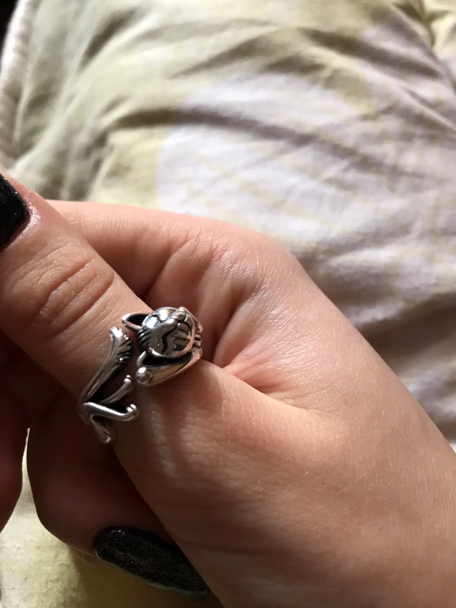 очень милое колечко!Под серебро с чернотой.Хвостик и головка котика плотно прижаты.Размер соответствует.Спасибо.