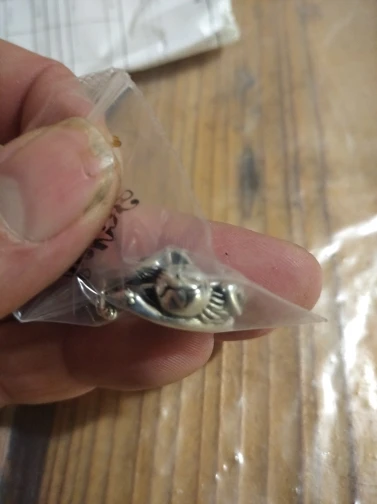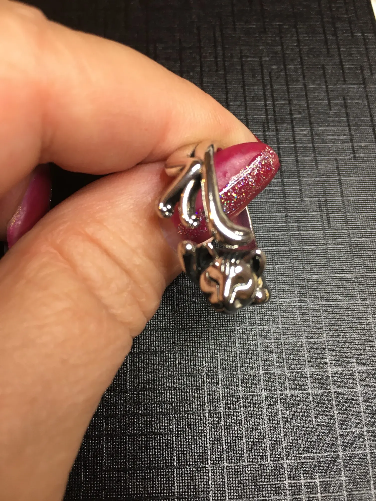 В целом - похоже на фото продавца, но очень блестящее напыление и немного иные пропорции (лапки тоньше, мордочка острее). Носила сутки не снимая, в том числе в душе - пока тёмных следов не оставляет, аллергии нет.