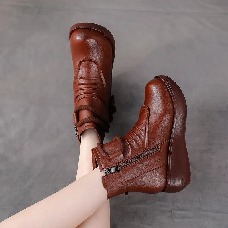 Женские ботинки на платформе OUKAHUI, Винтажные ботинки из натуральной кожи на плоской подошве, теплая плюшевая обувь с круглым носком, увеличивающая рост, на осень-зиму 2021