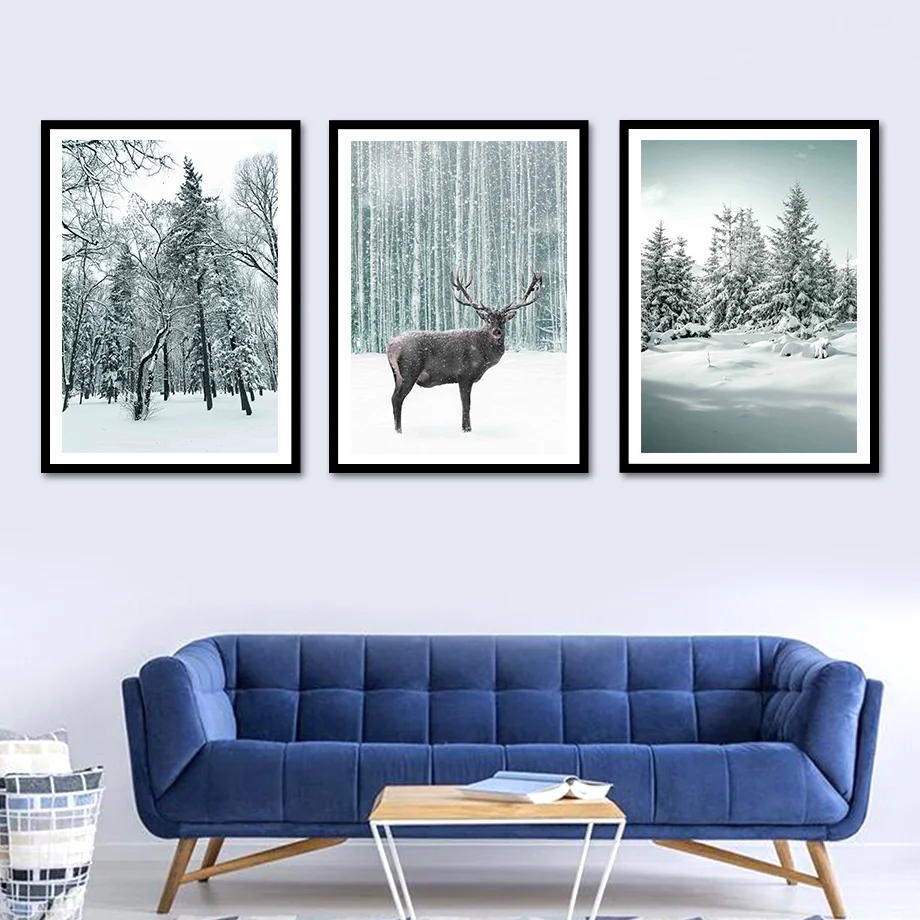 Настенная картина на холсте, постеры и принты с изображением сосны, дерева, оленя, снега, шлема, гор, деревьев, декор для гостиной, Рождества