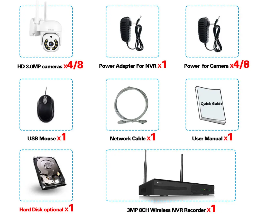 1x 8CH 3MP Беспроводной NVR4/8x3,0 Мп камеры4/8x источник питания для камеры1x источник питания для NVR1x USB мышь (подарок)1x 3 фута 1 м Ethernet кабель (подарок)1x быстрая направляющаяЖесткий диск опционально