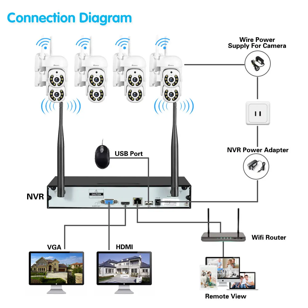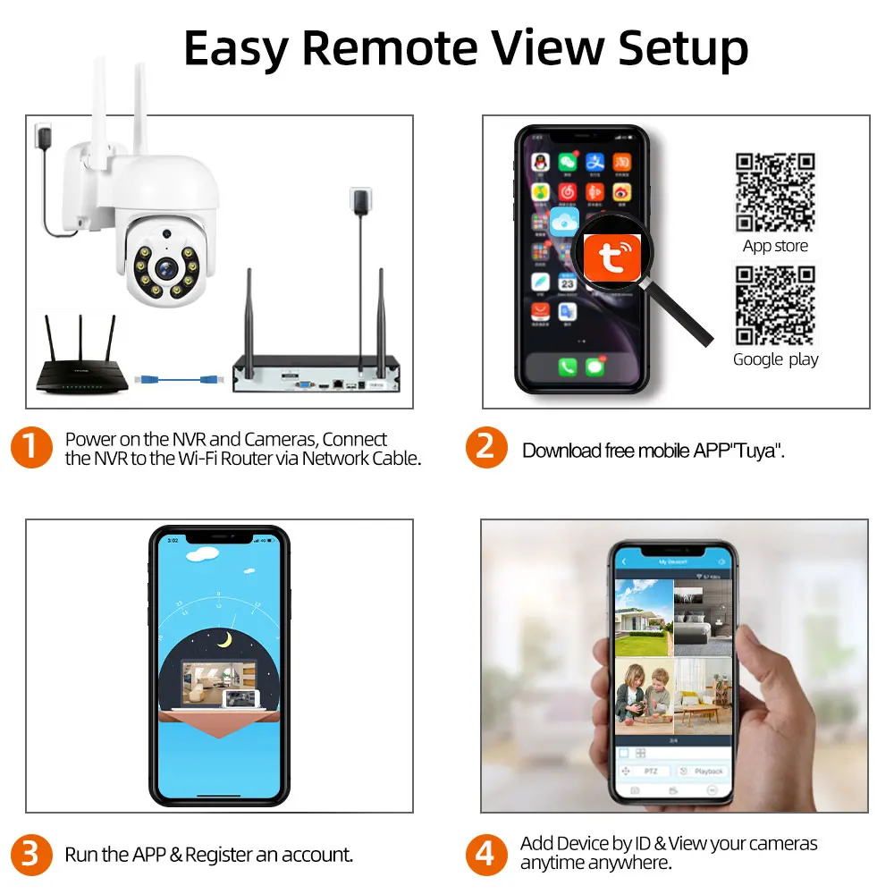 Простая настройка, всего 4 шага для просмотра мобильный телефон, просмотра видео в режиме реального времени из любого места и в любое время с помощью смартфона, стола или ПК с передовой технологией P2P, вы можете получить удаленный доступ к вашей системе за считанные минуты или меньше, нет необходимости в переадресации, удаленный доступ никогда не был таким простым!