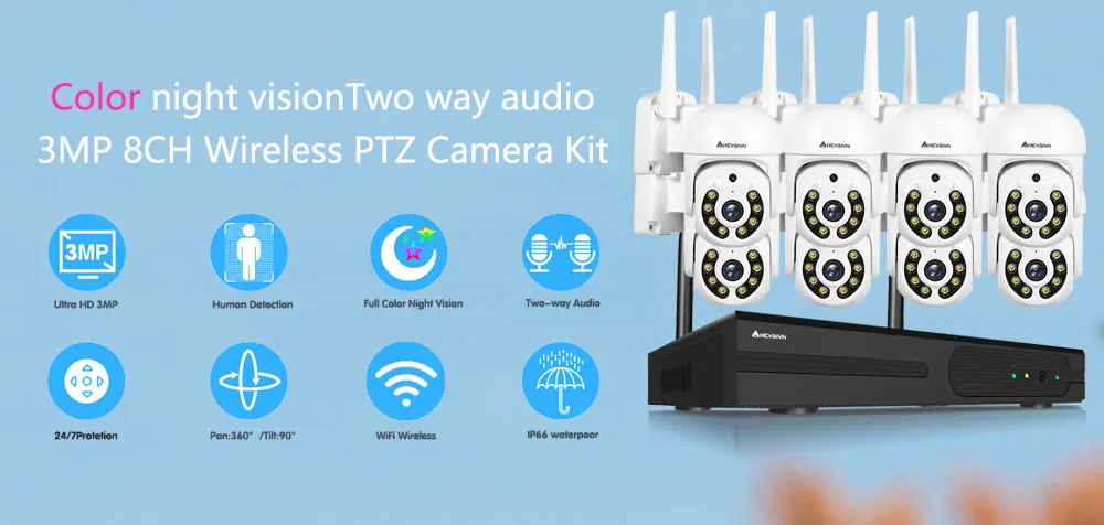 Система видеонаблюдения HD, Wi-Fi, PTZ 3 Мп 8 каналов, комплект беспроводного видеорегистратора, двусторонняя аудиосвязь, наружная IP-камера, система видеонаблюдения