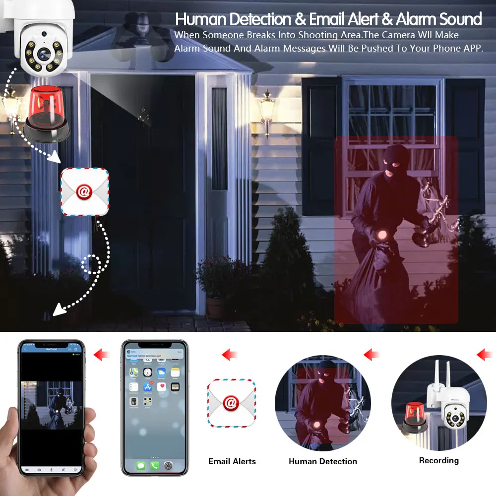 Когда человек проходит через зону сигнализации, камера обнаруживает движение человека. В то же время, 4 белый светодиодный светильник s будет светильник, чтобы показать ночной цвет.