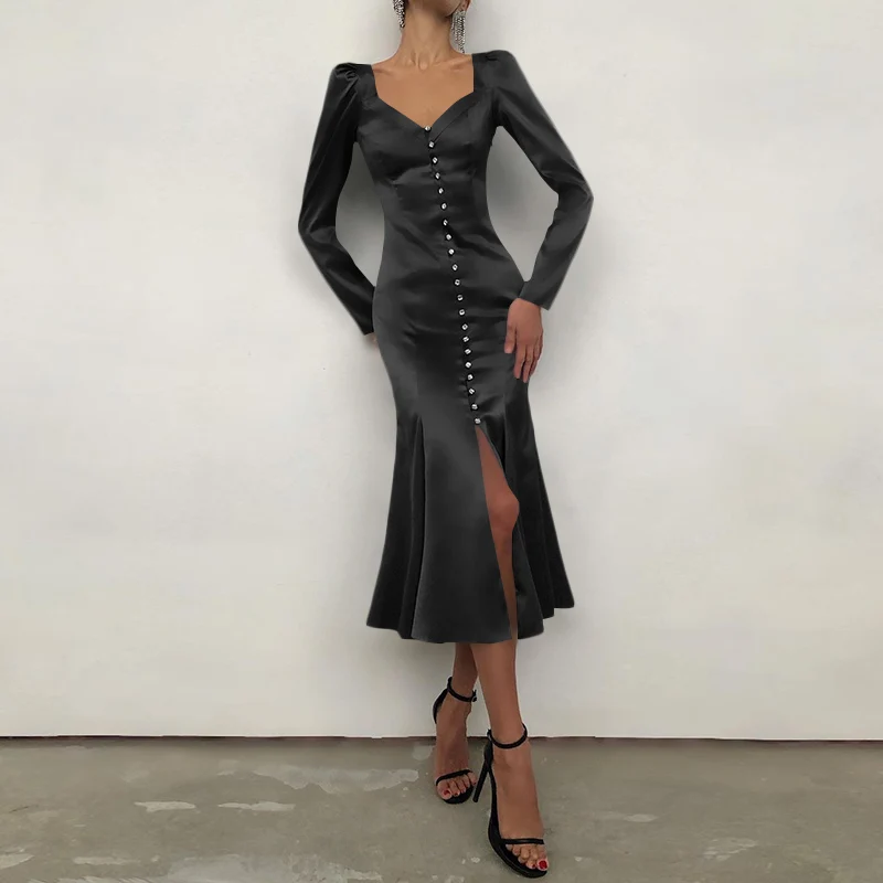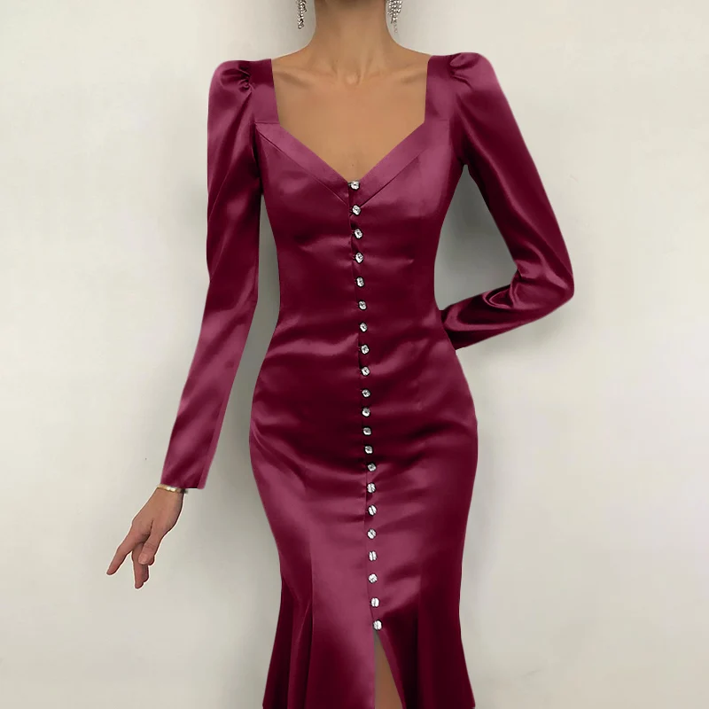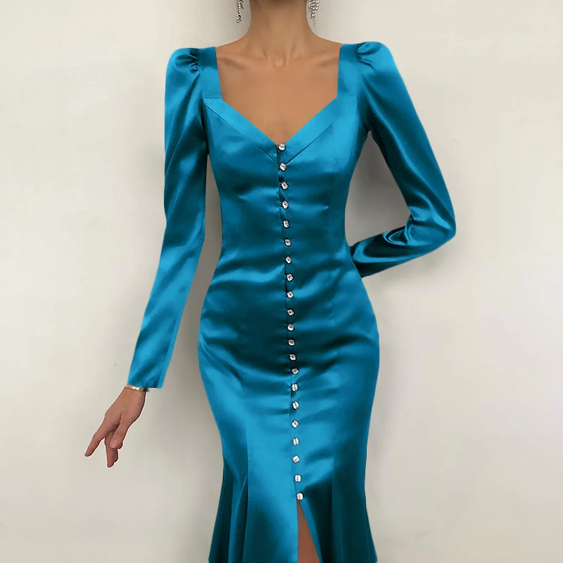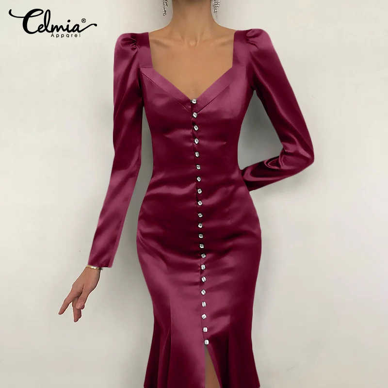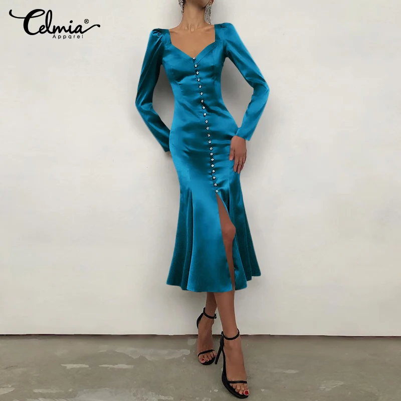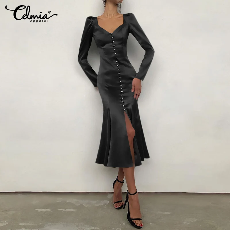 Celmia 2022 модное женское атласное элегантное платье с V-образным вырезом и длинным рукавом, средней длины с разрезом, Повседневное платье на пуговицах для вечеринок, большие размеры