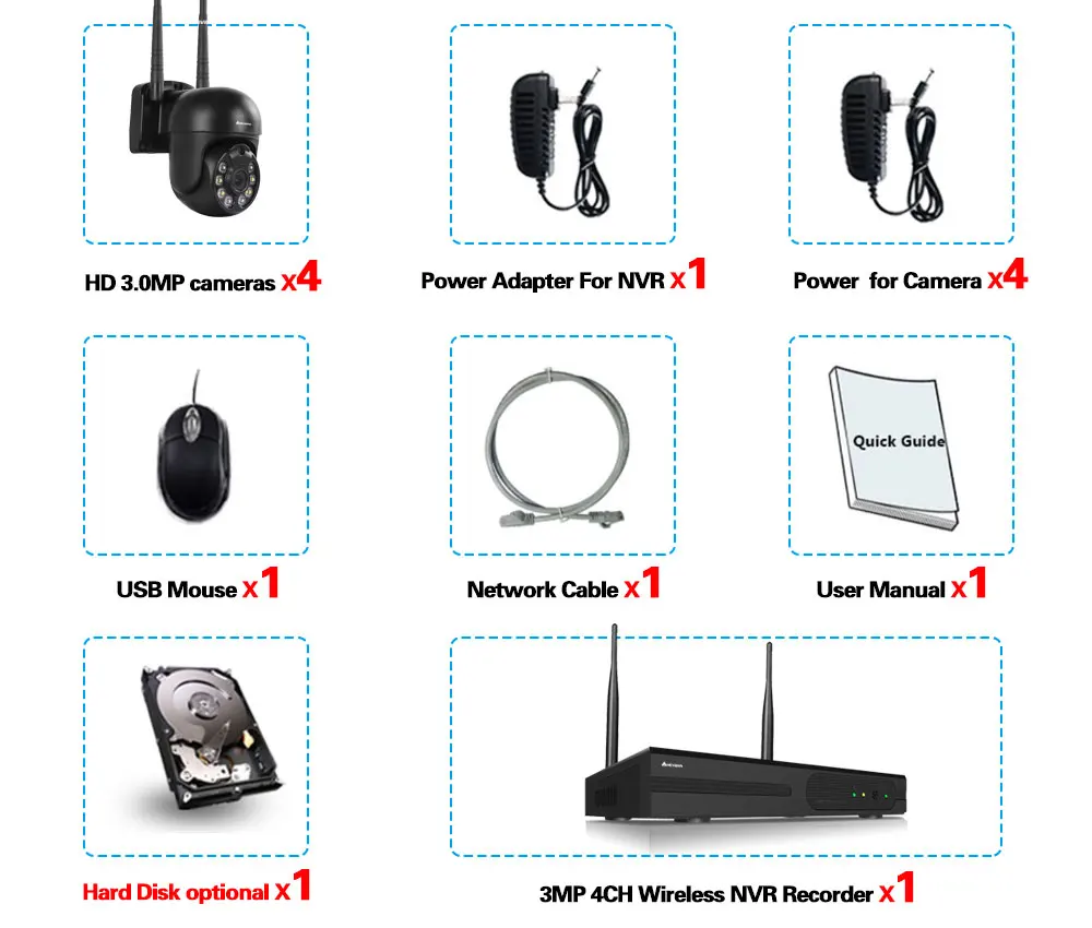 1x 4CH 3MP беспроводной WiFi NVR рекордер;4x Ультра HD 5MP беспроводная WiFi пуля ip-камеры;4x источник питания для камеры;1x источник питания для NVR;1 usb-мышь (подарок);1x 3 фута 1 м Ethernet кабель (подарок);1x быстрая инструкция;Жесткий диск опционально!