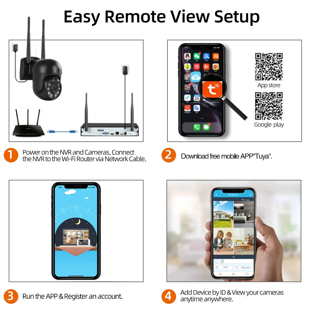 Простая настройка, всего 4 шага для просмотра мобильный телефон, просмотра видео в режиме реального времени из любого места и в любое время с помощью смартфона, стола или ПК с передовой технологией P2P, вы можете получить удаленный доступ к вашей системе за считанные минуты или меньше, нет необходимости в переадресации, удаленный доступ никогда не был таким простым!