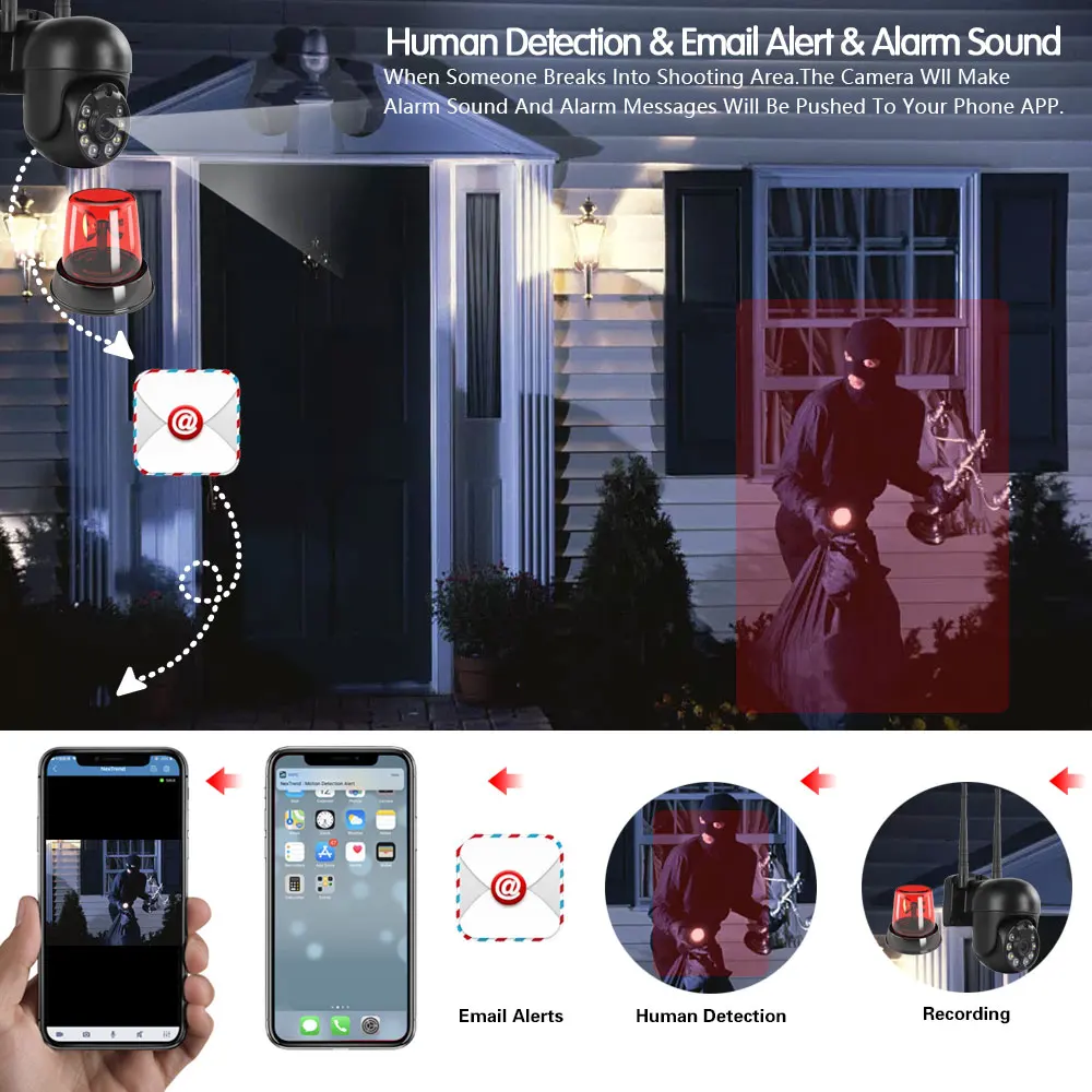Когда человек проходит через зону сигнализации, камера обнаруживает движение человека. В то же время, 4 белый светодиодный светильник s будет светильник, чтобы показать ночной цвет.