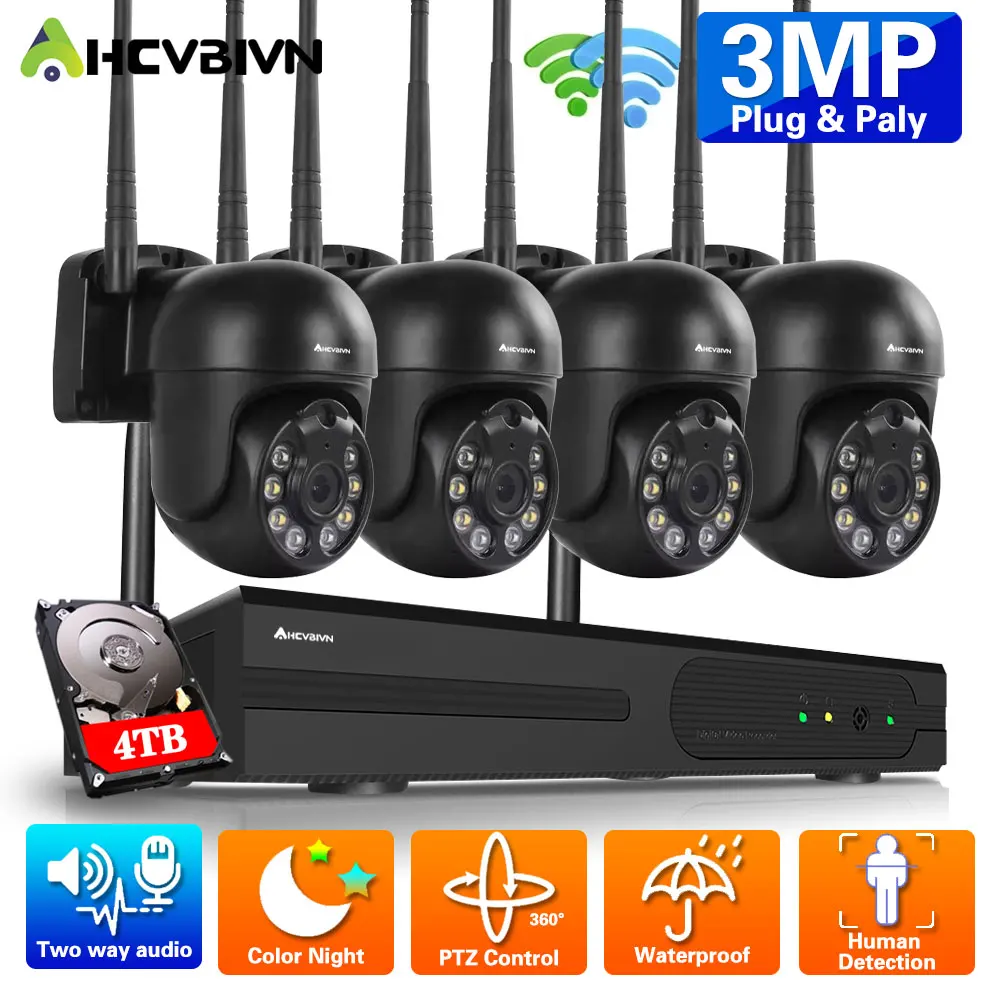 3MP для видеонаблюдения Купольная Camera Kit Wifi 4CH NVR Set Outdoor Color Night Vision PTZ IP Camera система видеонаблюдения 2MP HD