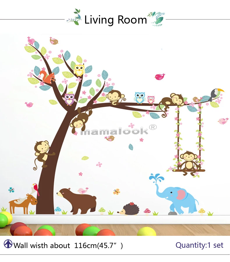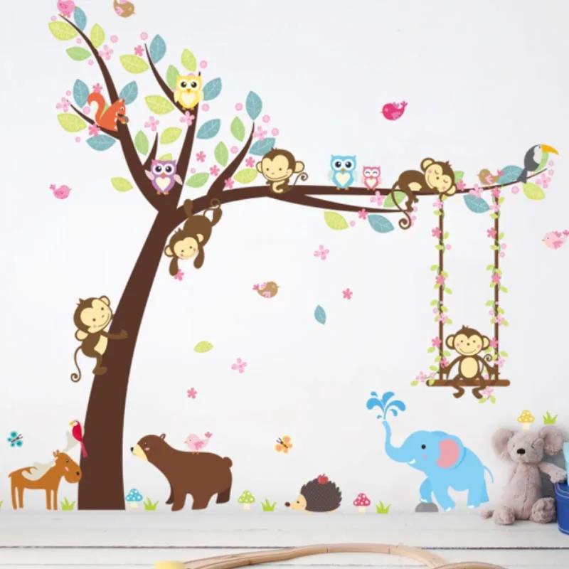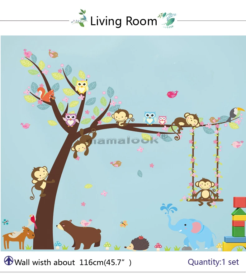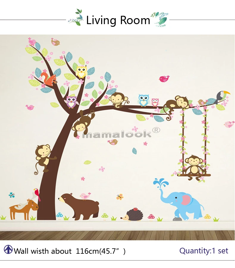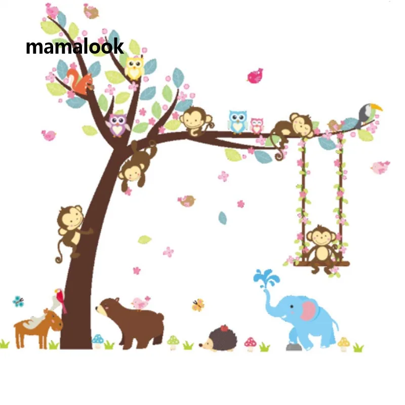 Лесные животные, наклейки на стену, обезьяна, медведь, дерево для д...