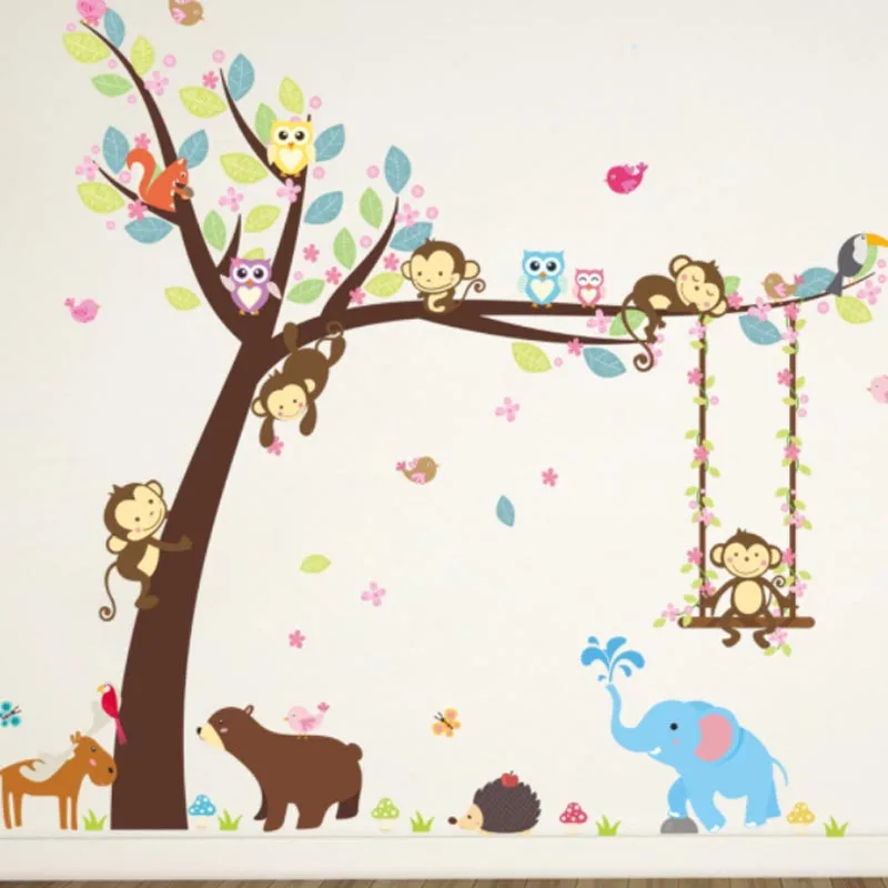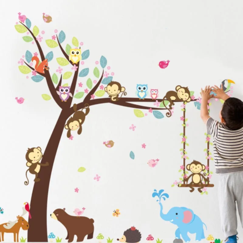 Лесные животные, наклейки на стену, обезьяна, медведь, дерево для детской комнаты, Детская настенная наклейка, Детская фотография