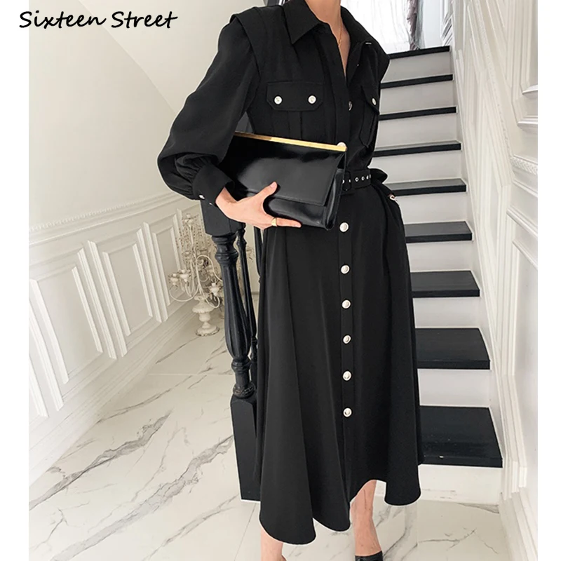 Осенне-зимнее черное платье на золотых пуговицах для женщин, шикарн...