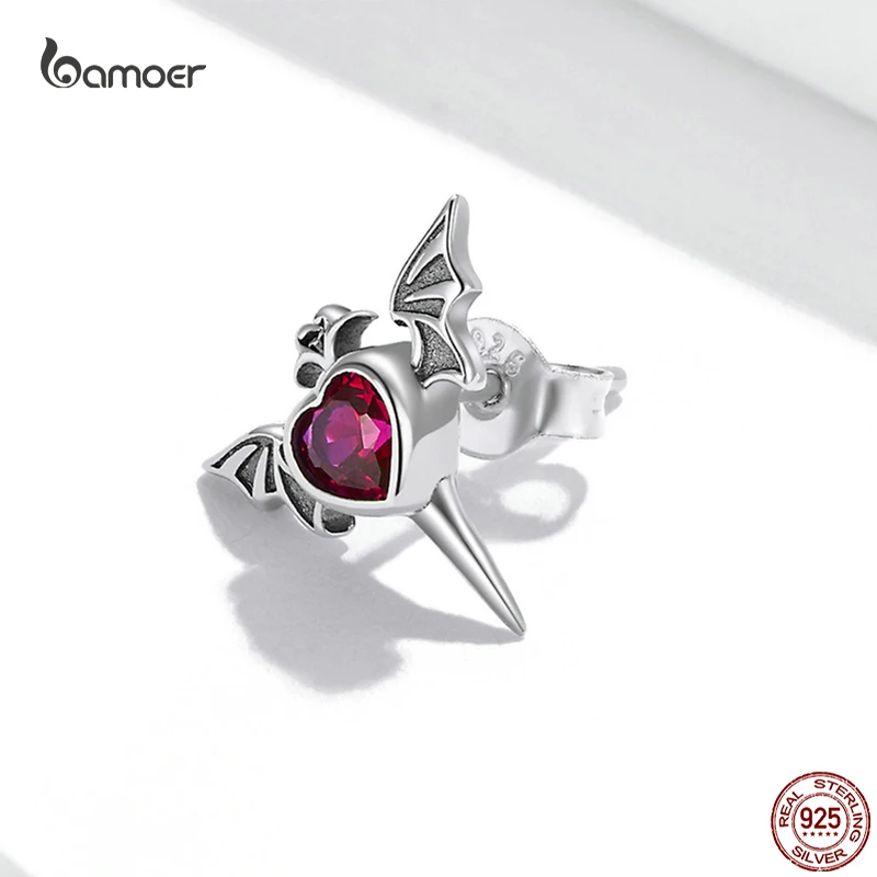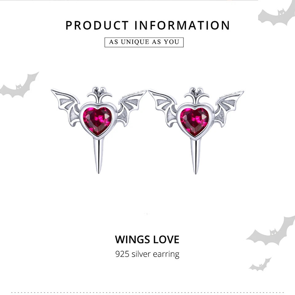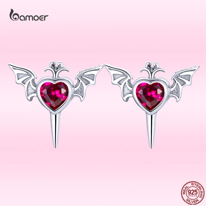 Женские серьги-гвоздики Bamoer, из настоящего стерлингового серебра 925 пробы, в стиле панк, гиппопа, с крыльями, в форме сердца, из чистого циркония, уличные модные ювелирные изделия