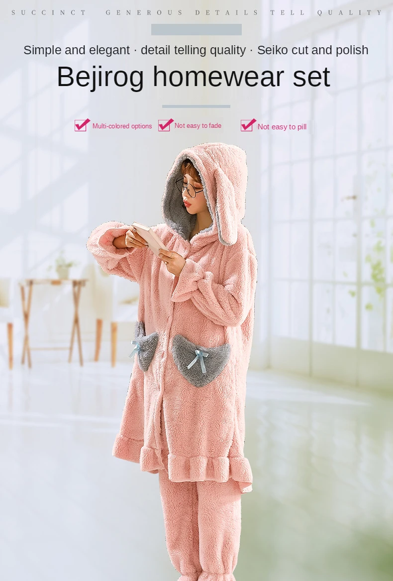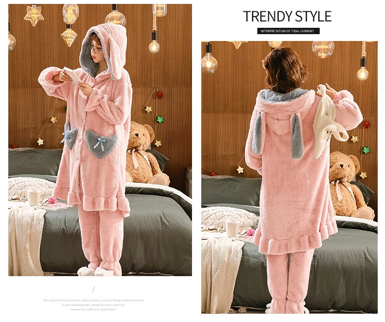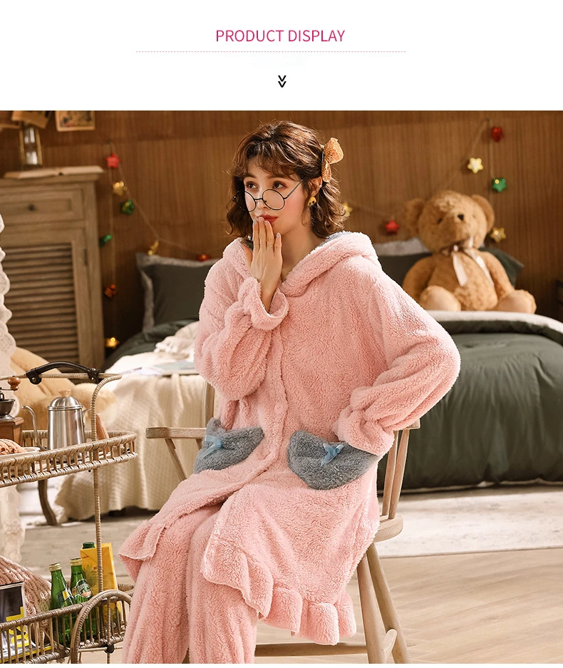 Теплая женская пижама, зимняя одежда для сна, толстый флисовый свободный длинный халат из кораллового флиса, костюм из 2 предметов, пижамные комплекты для женщин, домашняя одежда, пижама