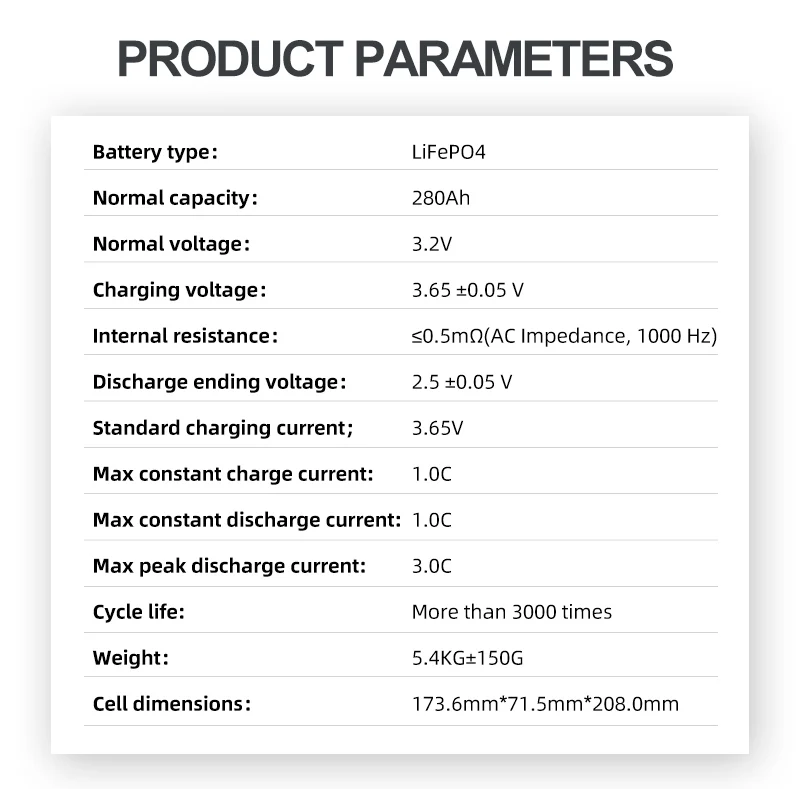 Нормальная мощность: 280ahНормальное напряжение: 3,2 VНапряжение при зарядке: 3,65 ± 0,05 VВнутреннее сопротивление: ≤ 0,25 МОмРазрядки конец напряжение: 2,5 ± 0,05 VСтандартный зарядный ток: 0.5CСтандартный ток разрядки: 0.5CМаксимальный ток заряда: 1сМаксимальный ток разряда: 3CВес: 5220 ± 200 г