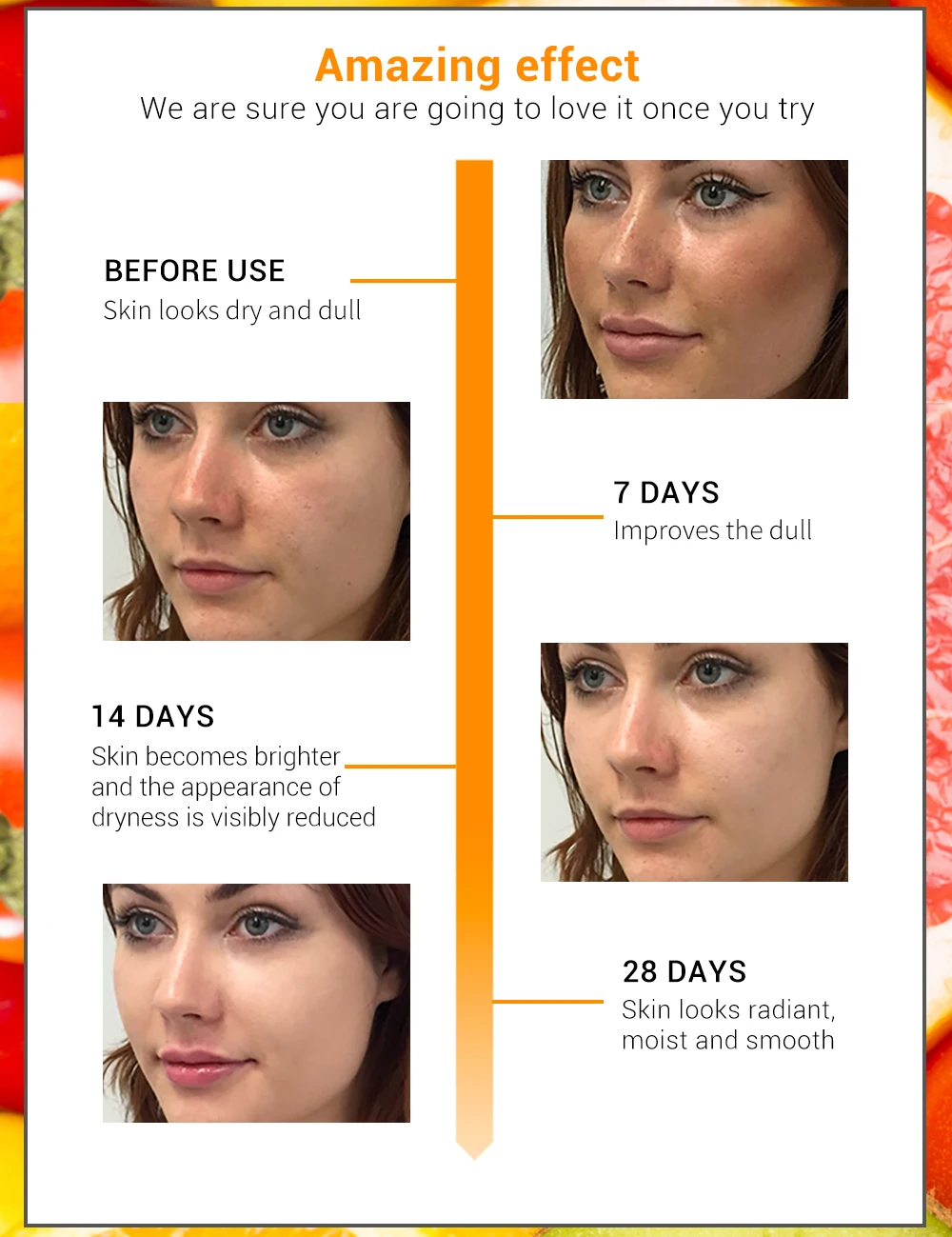 ▶Мы уверены, что вам понравится, когда вы попробуетеПеред использованиемКожа выглядит сухой и тусклой7 днейУлучшает тусклый14 днейКожа становится ярче, а внешний вид сухости заметно уменьшается28 днейКожа выглядит сияющей, влажной и гладкой