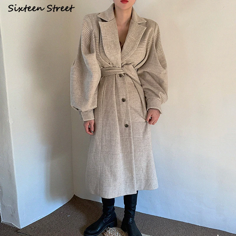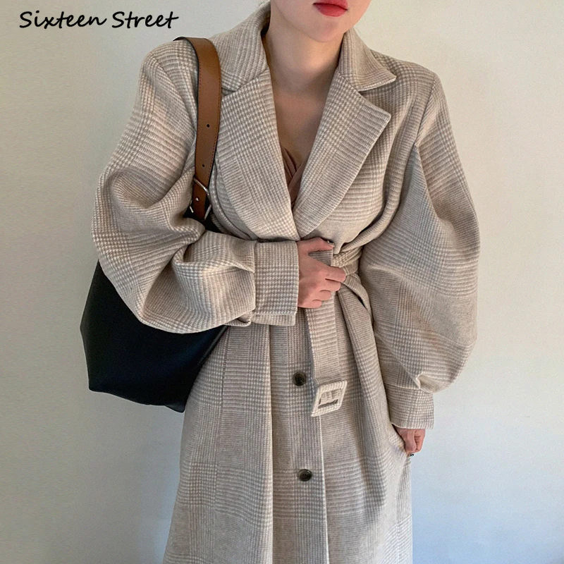 Женское шерстяное пальто в клетку, винтажное пальто цвета хаки с поясом, утепленная длинная куртка из смешанной шерсти, зима-осень 2021