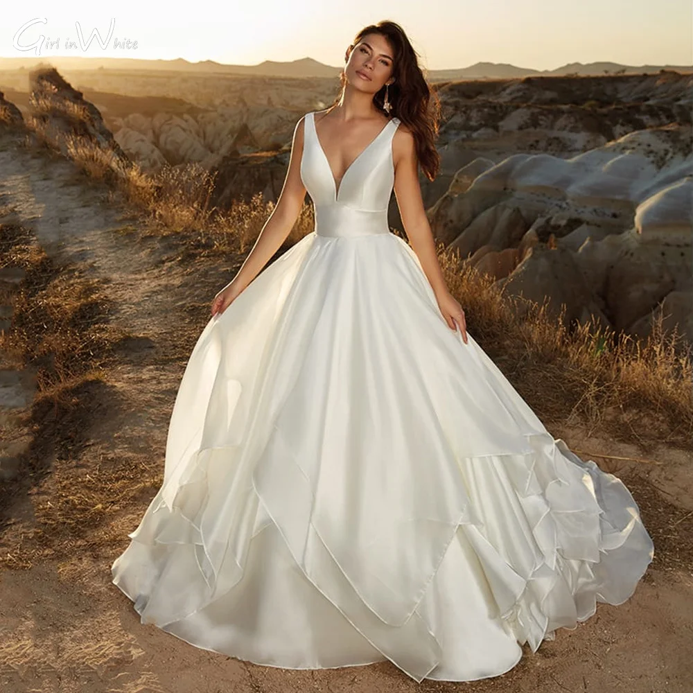 Женское атласное свадебное платье It's yiiya, белое современное ТРАПЕЦИЕВИДНОЕ ПЛАТЬЕ со шлейфом, V-образным вырезом и открытой спиной на лето 2019
