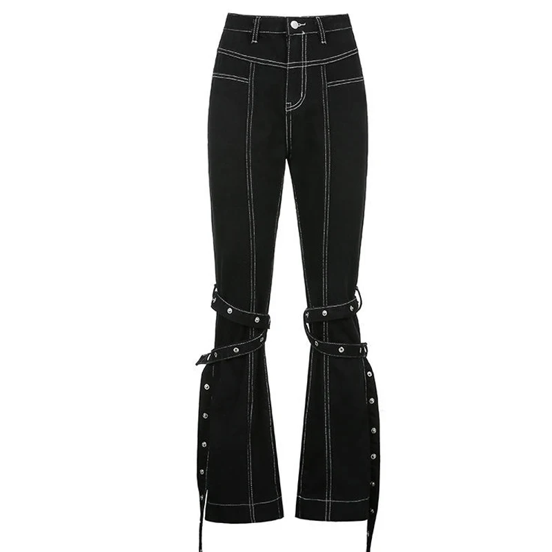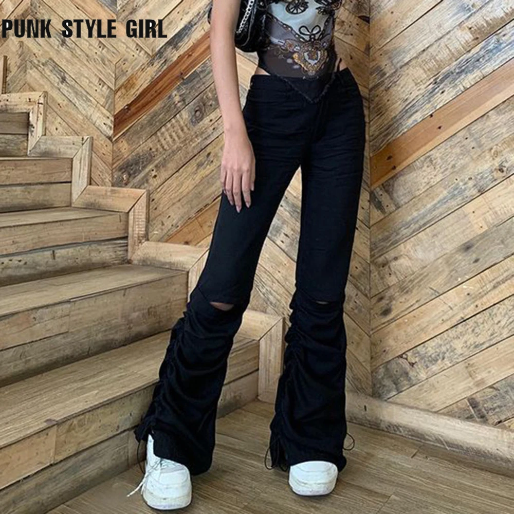 Брюки Cyber Y2K женские Techwear, готические брюки в стиле эмо и АЛТ, с темным принтом в стиле панк, джинсы с вырезами, на пуговицах, черные хиппи готические штаны в стиле 90-х