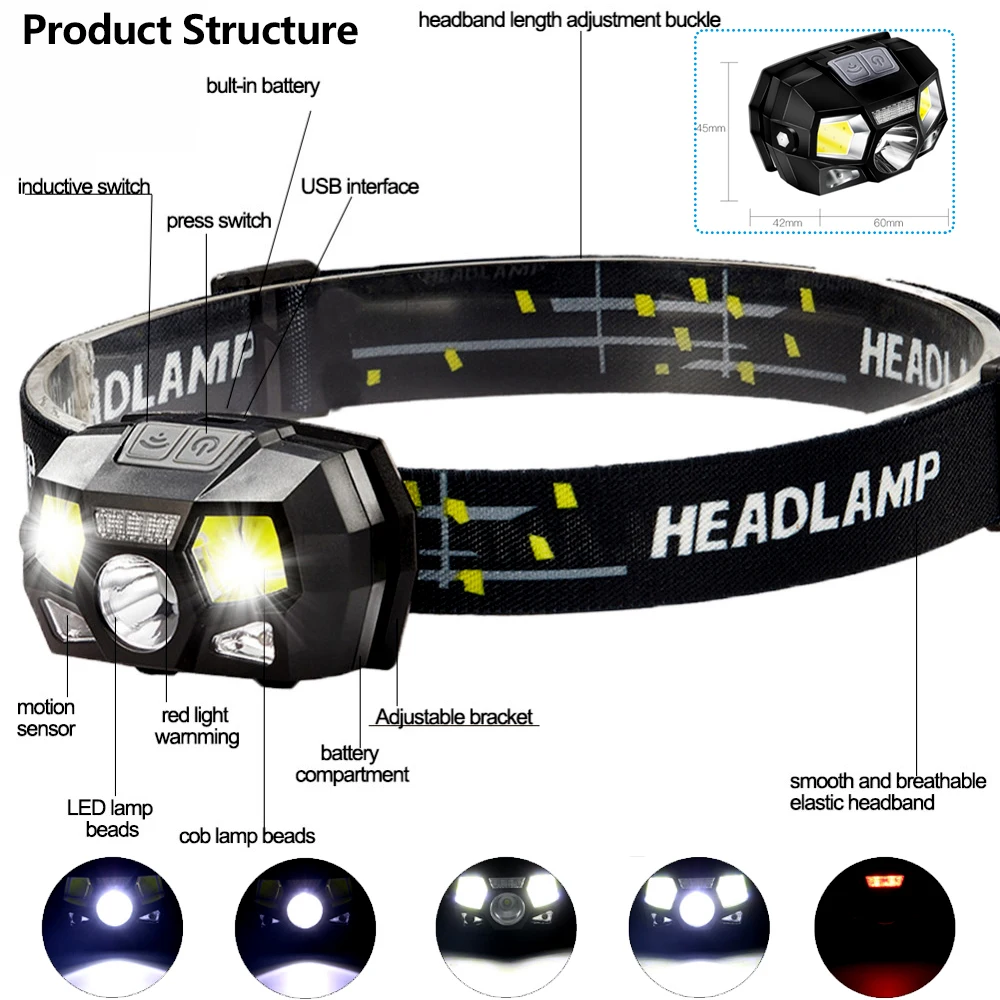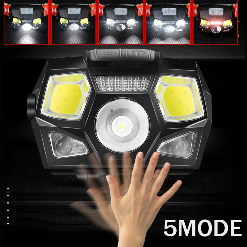 Светодиодный налобный фонарь 8000 Люмен, супер яркий датчик движения, мощный головной светильник, перезаряжаемый через USB, водонепроницаемый светильник