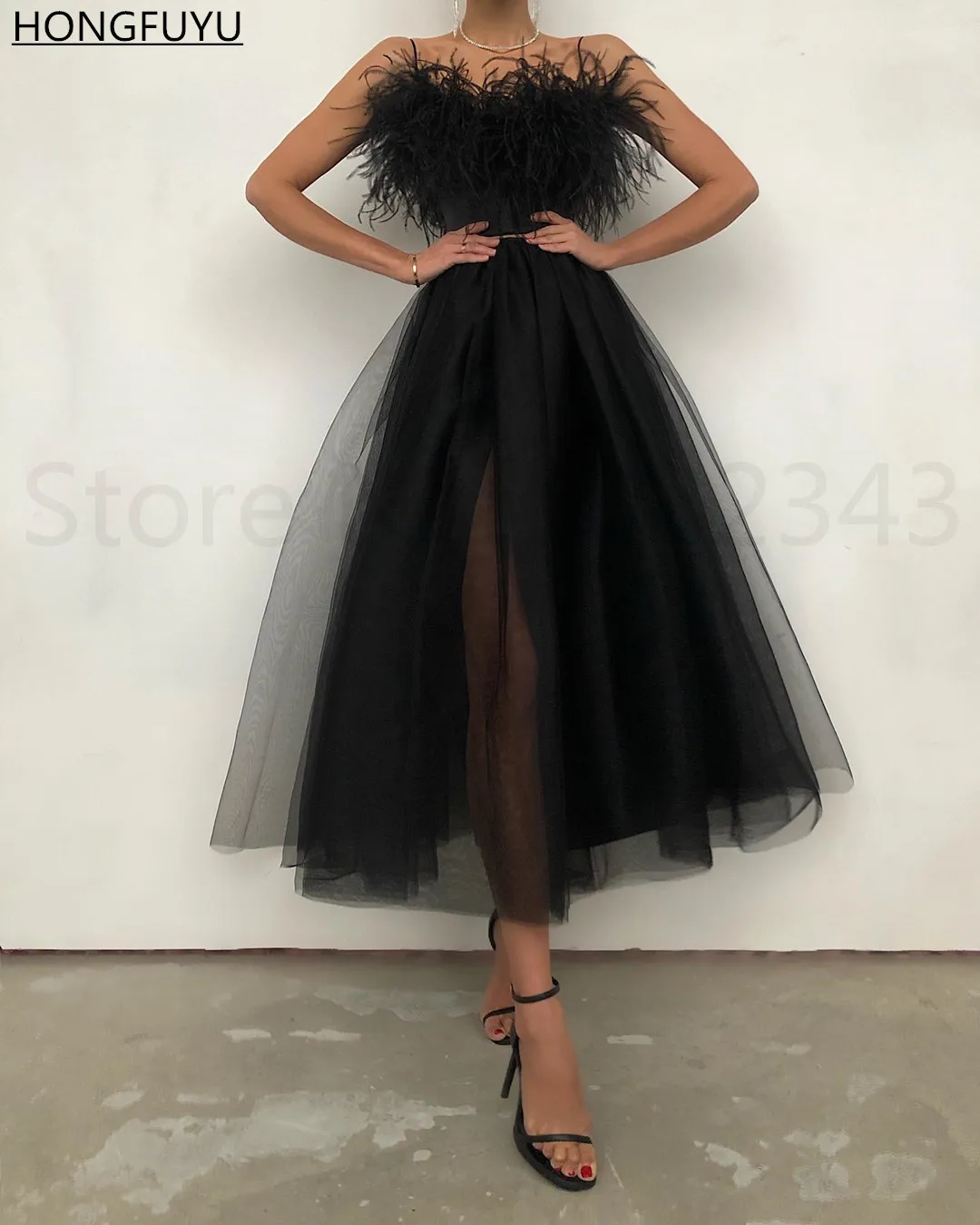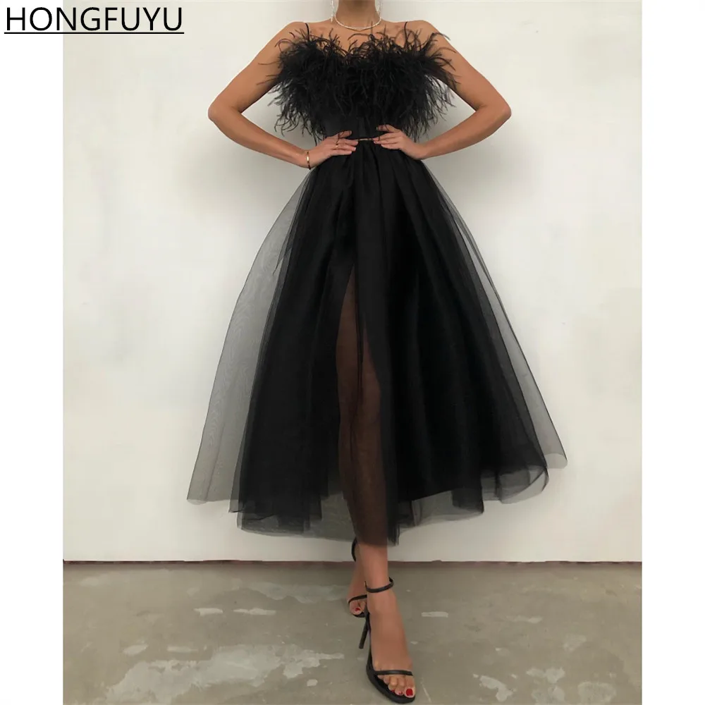HONGFUYU 2022 черные коктейльные платья с перьями Тюль ТРАПЕЦИЕВИДНОЕ короткое платье для выпускного вечера на тонких бретелях robe de mariage
