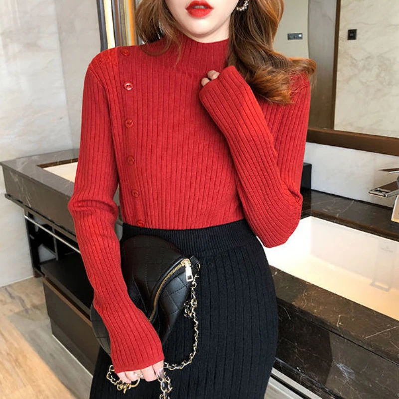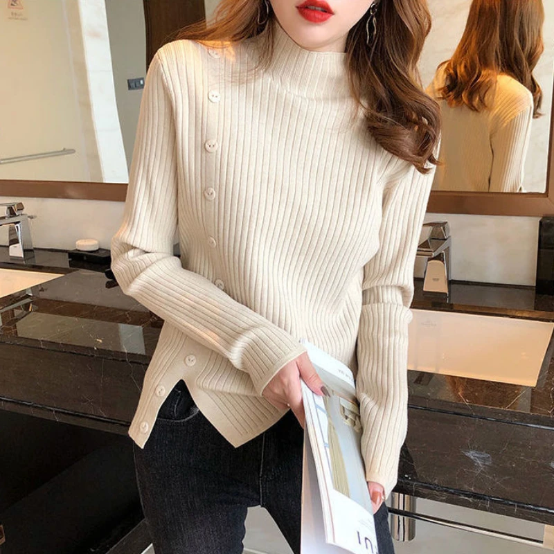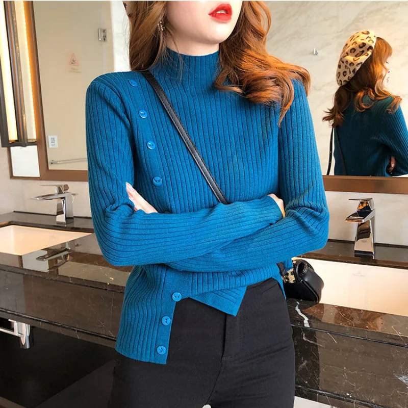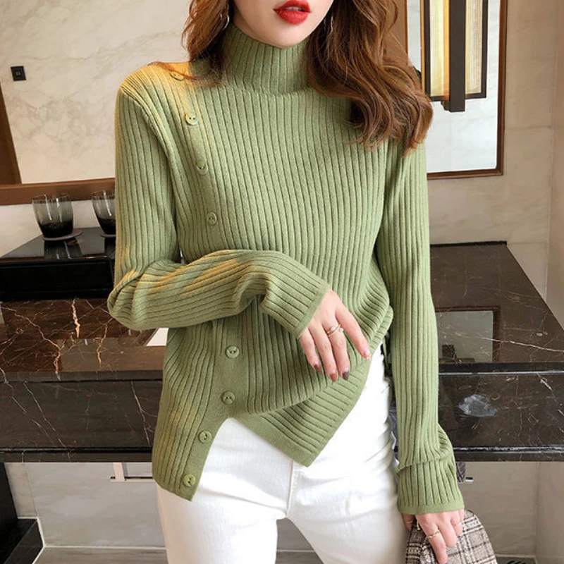 Осенне-зимний новый женский свитер с пуговицами и высоким воротником, джемпер с разрезом, вязаный свитер, Модный женский свитер