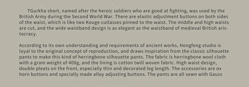 ⦁ Дизайн основан на винтажных брюках gurkha ⦁ изготовлен из смеси шерсти herringbone два боковых кармана ⦁ задние карманы с клапаном ⦁ регуляторы талии (см. Нашу детальную картинку ниже) ⦁ высокая посадка, передние складки, конические ножки Fabric ткань: 75% шерстяная верхняя часть, 100% хлопковая саржа подкладка