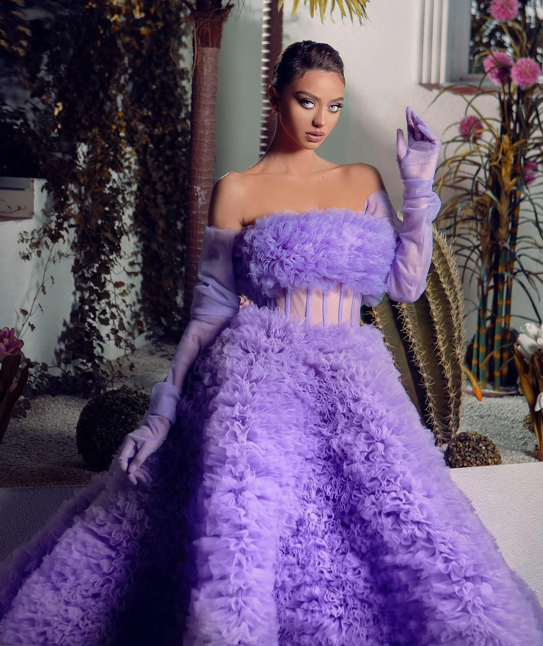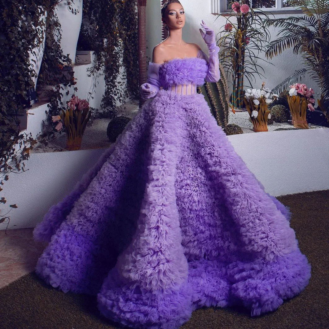 Женское вечернее платье, длинное Пышное с оборками из тюля лавандов...