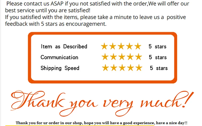 Отгрузка 1. Доставка по всему миру 2. Все товары тщательно проверяются перед отправкой. Мы упакуем его хорошо и отправим посылка как можно скорее. И будет небольшая задержка во время праздников. 3. Пожалуйста, заполните ваше полное имя и правильный адрес, любой запрос о декларируемой стоимости для таможни, затем сделайте отметку в заказе или свяжитесь с нами в любое время 4. Если вы не можете получить товар, пожалуйста, свяжитесь со мной для получения помощи Оплата 1. Мы принимаем Ali pay, West Union, TT. Все основные кредитные карты принимаются через безопасный платежный процессор ESCROW. 2. Вы можете оплатить через Visa, Mastercard, Western Union, Qiwi и банковский перевод. 3. Оплата должна быть произведена в течение 3 дней после размещения заказа. Отзывы 1. В том случае, если вы не получите ваш заказ исправно, мы будем благодарны, если вы могли бы оставить нам 5-звездочный положительный отзывы. 2. Пожалуйста, сначала свяжитесь с нами, если вы не удовлетворены полученным товаром, мы предложим вам удовлетворительное решение для ваших отзывы или споров, мы дадим вам ответ в течение 24 часов, если вы не получили ответ в течение этого времени, пожалуйста, повторите их. Спасибо за понимание!