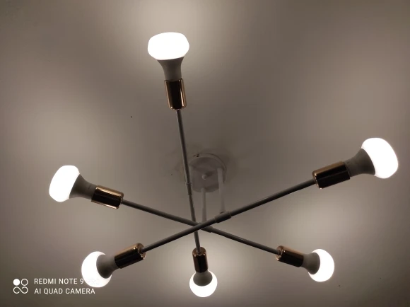 Долго добралась до меня эта люстра, боялась, что не получу. Наконец-то она там, где я хотела - на потолке гостиной. Мне нравится её дизайн, на площадь 16 кв м. самое то. Купила большие круглые лампочки.