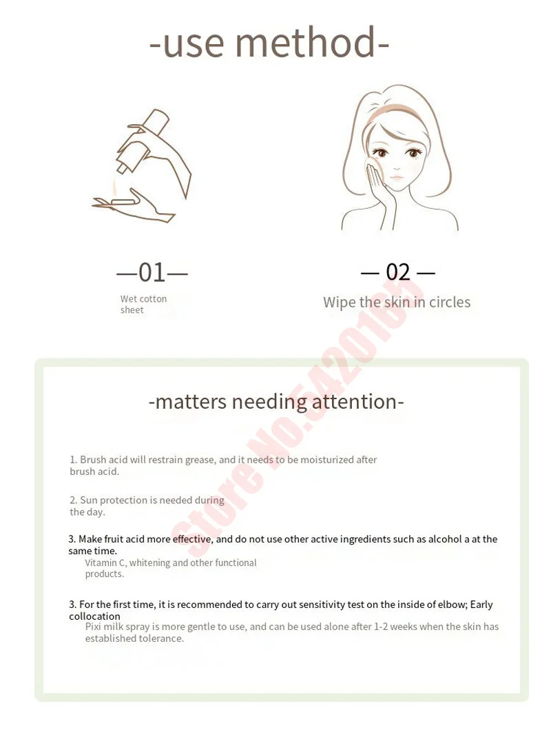 01-влажный хлопковый лист02-протрите кожу кругами-Вопросы, требующие внимания-1. Кисть-кислота будет удерживать жир, и она должна быть увлажнена после кисточек.2. Защита от солнца требуется в течение дня.3. Сделайте фруктовую кислоту более эффективной и не используйте другие активные ингредиенты, такие как спирт А одновременно. Витамин с, отбеливание и другие функциональные продукты.4. В первый раз рекомендуется провести тест на чувствительность на внутренней стороне локтя; Раннее сглаживание Pixi молочный спрей является более мягким в использовании, И может использоваться только через 1-2 недели, когда кожа установила толерантность.