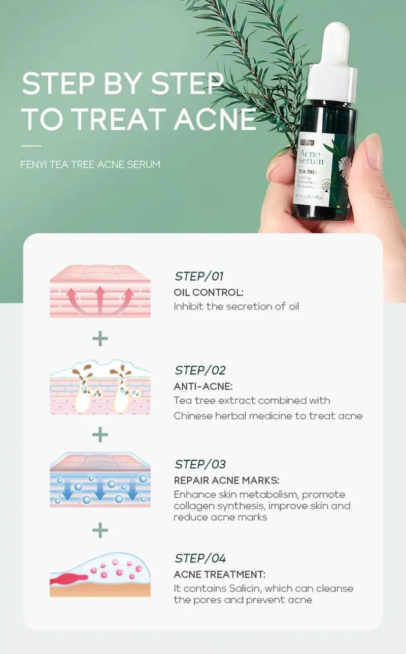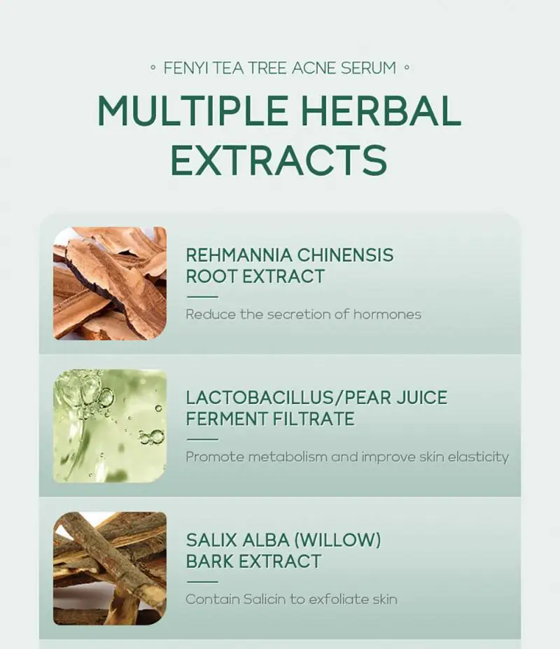 Выбранная формула «T + X» для сыворотки угрей чайного дерева Fenyi содержит масло листьев мелалеуки альтернифолии (чайное дерево), лактобактерию/фермент грушевого сока, экстракт корданных Houttuynia, экстракт корня Baicalensis Scutellaria и экстракт семян глицина сои (СОИ), который может помочь очистить грязь, жир, омертвевшую кожу и успокоить акне, Препятствует появлению прыщей. Он может глубоко впитывать влагу, делая вашу кожу мягкой и гладкой.