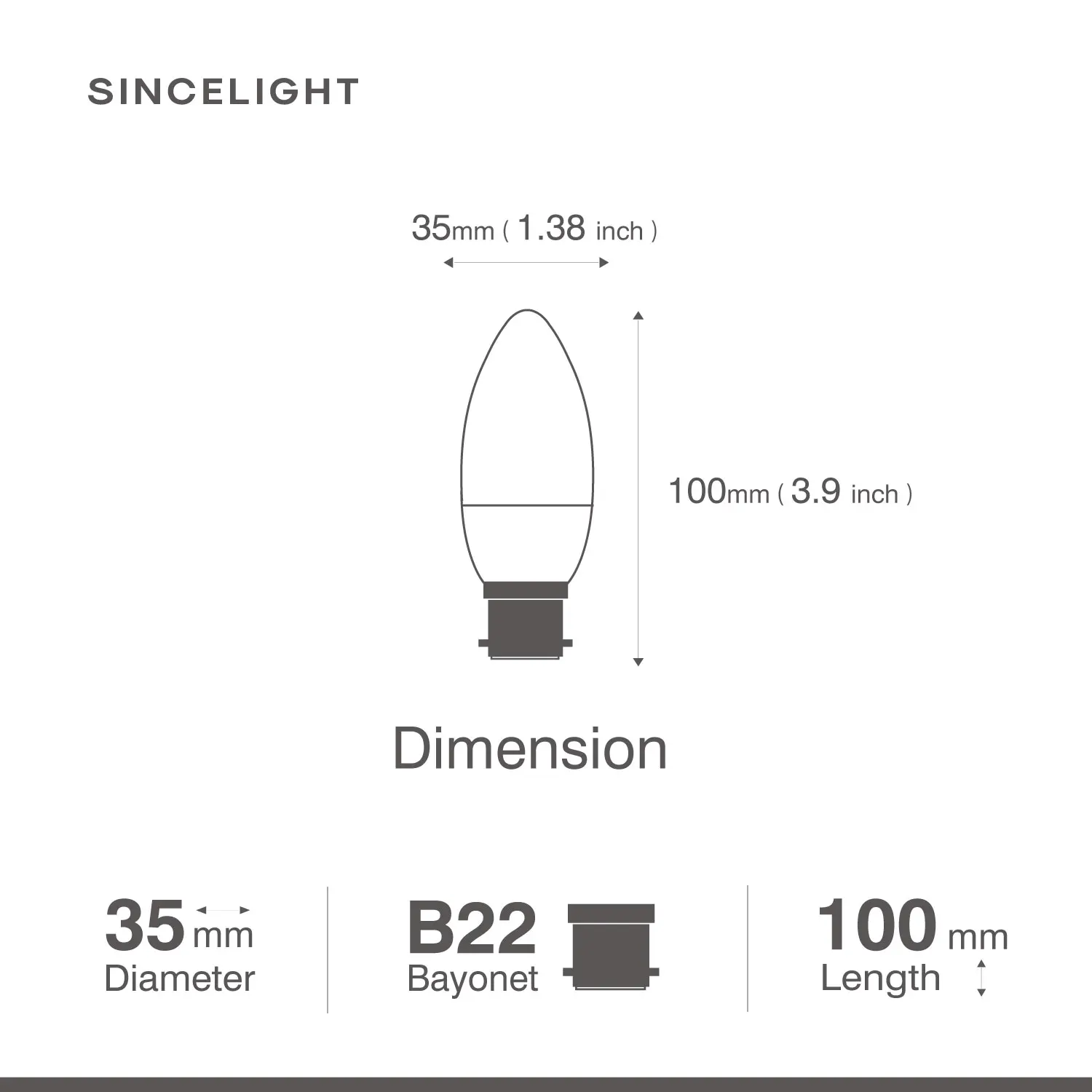 Идеальная замена свечей накаливания с гладким и элегантным outlookпредназначен для замены свечей накаливания, светодиодный светильник SINCELIGHT® имеет гламурный и величественный внешний вид с невероятной производительностью освещения, что значительно снижает затраты на электричество и техническое обслуживание. Светодиодный набор свечей SINCELIGHT® доступен в нескольких стеклянных отделках, которые удовлетворяют множество применений, таких как люстры, подставки для свечей, декоративное освещение и общее освещение.
