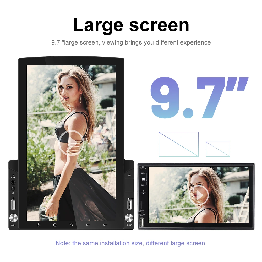 Features:●HD 9.7'' Glass Mirror auto radio player●Vertical screen: the display effect is more three-dimensional●Upgraded Dual system mirror link:IOS/Android mirror link IOS one-way:IOS supports mobile phone one-way projection to the machine Android two-way:Android supports mobile phone two-way connection●Built-in GPS Navigation: Users can purchase directly from play store for offline navigation. With wifi connected, Google Maps can be used perfectly, you can go anywhere you want and never get lost again.● Built-in WIFI: Connect to WIFI, and you will find a new world,the most convenient one is the online map.●Rear view camera: Need to choose the camera,the car is connected to the reverse gear to automatically switch(requires optional)●Steering wheel control: Through it you can control the functions you need by steering wheel, more convenient●Built-in Bluetooth with A2DP/Hands Free/Phone book:Bluetooth hands-free calls,Bluetooth music player,Auto loading phonebooks●Driving recorder: You can choose a recorder, and the car has playback, the evidence can be retained●Double USB adapter input,USB fast charge●Support file manager: Support download, install and delete over thousands of android apps●Support multilanguage: Support languages, up to 40 national languages●You can enjoy music from you mobilephone without any cables, and also support USB connetion.●FM Radio: Online music you can transfer the music to the car stereo by FM to enjoy the original car stereo sound,with 18 preset stations● Time Setting:You can use the network or GPS to open the date and time automatically, or you can adjust it manually.Specifications:System:AndroidChipset:8227L-DEMOScreen size:9.7''Memory:1GB (RAM)+16GB (ROM)Screen resolution:1024*600Mirror link:Android/IOSRadio chip:MTKPower output:4*45WWork temperature:-40℃-80℃Steering wheel control function:SupportBluetooth version:4.0Power amplifier chip:AC7388Radio Band:FMVideo output:SupportMaps:Built-in offline mapsWIFI:SupportUSB:Three USB interfaceCar logo change:SupportAudio format:APE/FLAC/WAV/MP3/WMA etcVideo format:MKV/RMVB/AVI/MP4/MDV etcPicture format:PNG/JPEG/JPG/GIF/WBMP/BNP etcFactory setting keyword:8888Language:Chinese/English/French/Italian/Korean/Japanese/Arabic/Spanish/Portuguese/Russian/Turkish/Vietnamese/Hebrew/Polish/GermanPackage Included:1 x Car MP5 Player1 x Power Cable1 x GPS Antenna1 x Camera Input1 x RCA Input and Output1 x USB Cable2 x Metal Frame4 x Screw1 x Instruction manualTips:1.Why can't turn on the car radio ?1.1Please check the Voltage of car radio:12V1.2When you test this car radio,you can combine the red and yellow wires and connect them to the positive side of the power supply.Black line to negative power supply.1.3Replace the same type of insurance to test the car radio.Note: Please must use our power cables to connect our car radio,it is not possible to insert the original car plug directly into our machine.2.Why the car radio will show "No Signal" when we reversing?Please check if the camera's line is properly connected to the car radio.Note:The video port of rear camera must insert the "CAMIN" port of car radio.3.Why does the camera display "!" and "Can't watch video while driving" when I use USB to watch videos?Please turn off the "Video Warning" function in the settings,then will be OK.4.Why can't search FM?4.1: No radio antenna inserted;4.2: Please check if the radio antenna is plugged in. Please insert more antennas several times to make it well contacted;4.3: The signal of your location is not good. Please go to a better place to test again4.4: The radio antenna on the car is broken/no effect; please replace the radio antenna and test again.5.Why can't connect the Bluetooth of car radio?5.1 Open the phone settings interface, open the Bluetooth in the Bluetooth function, search for Bluetooth devices, find the player's Bluetooth model to be paired; if you need a pairing code, enter 0000; if not, try 1234 or 123456.5.2 Please try to use another mobile phone to test this function.All methods are correct and still cannot use Bluetooth, Please unplug the plug on the back of the player and plug it in after 3 minutes.