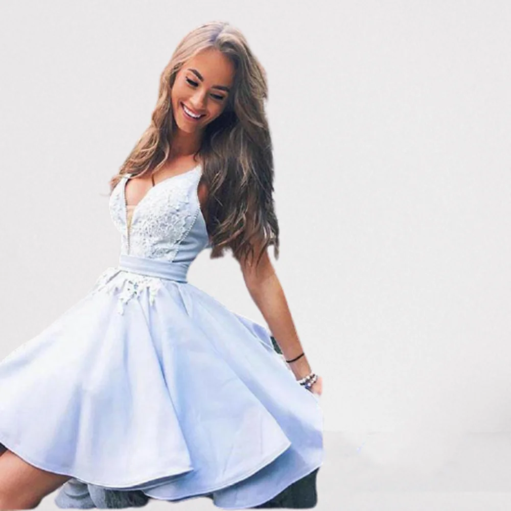 Платье для выпускного вечера с V-образным вырезом светло-голубое кружевное короткое платье для выпусквечерние вечера