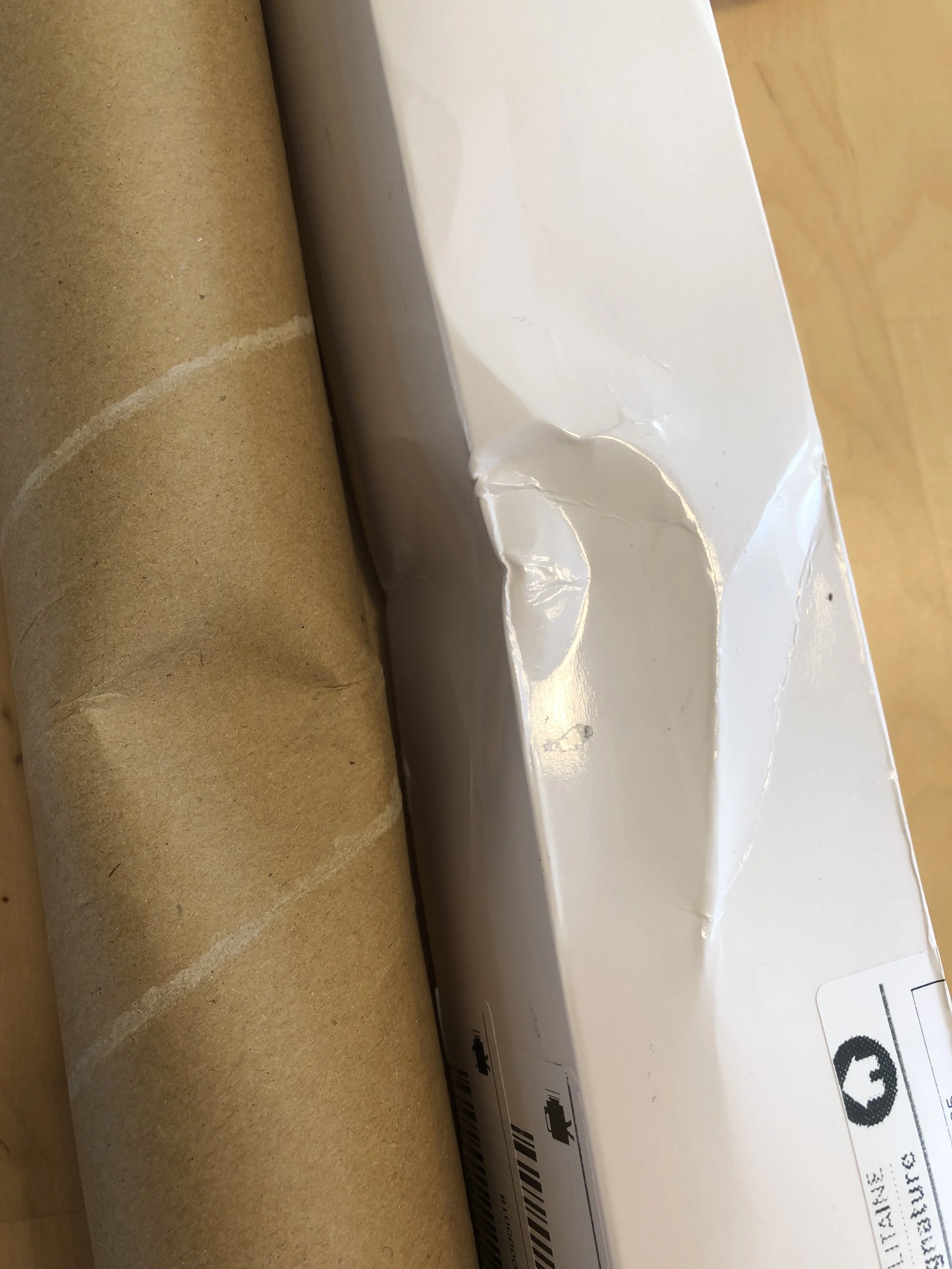 Упаковка помечена во время поездки. Продавец не имеет к этому никакого отношения. Французская почта неуважительно относится к своей посылке и тем более во время рождественского периода. Поэтому я благодарен продавцу за хорошую защиту груза. Плакаты, к сожалению, повреждены. Надеюсь, мы сможем лучше обращаться с повреждениями. Однако печать очень красивая. Акулы восхитительны. Спасибо продавцу за его серьезность.