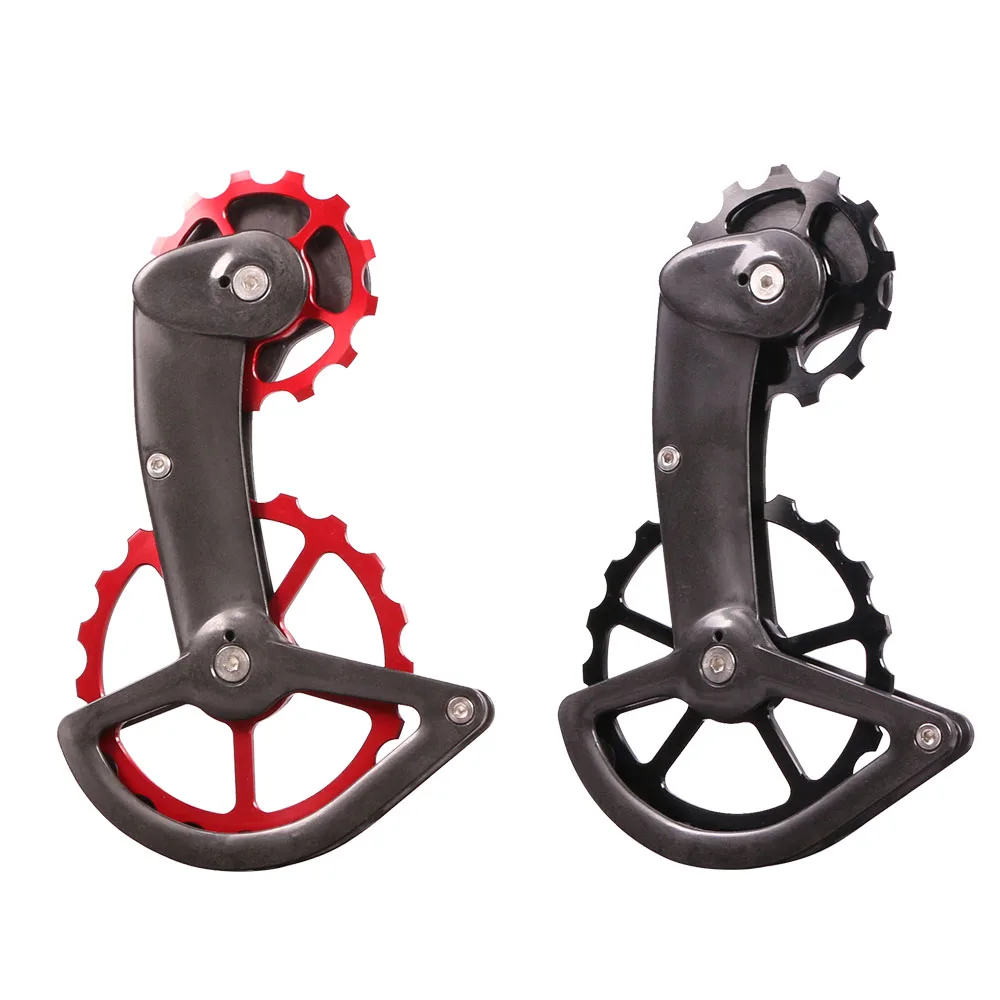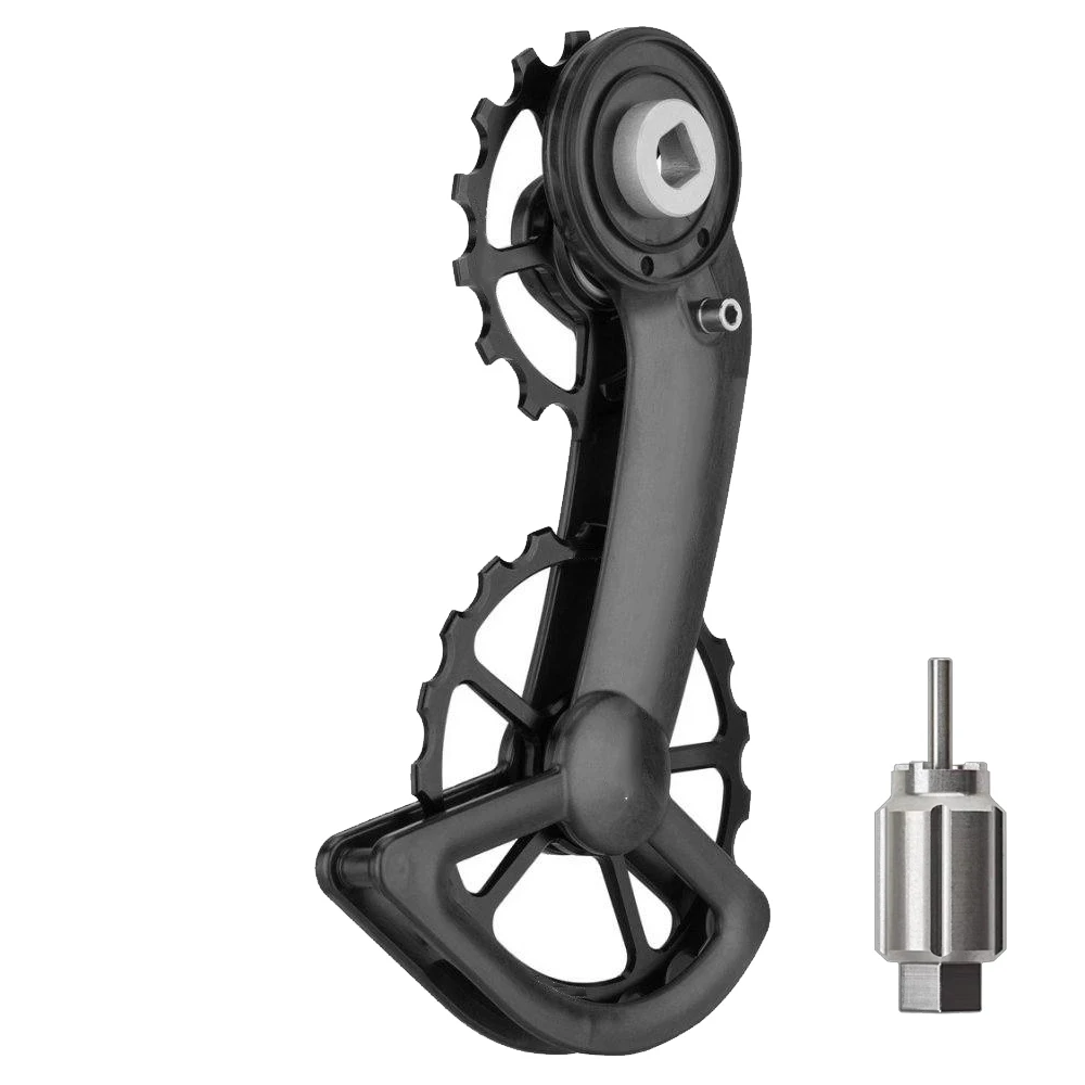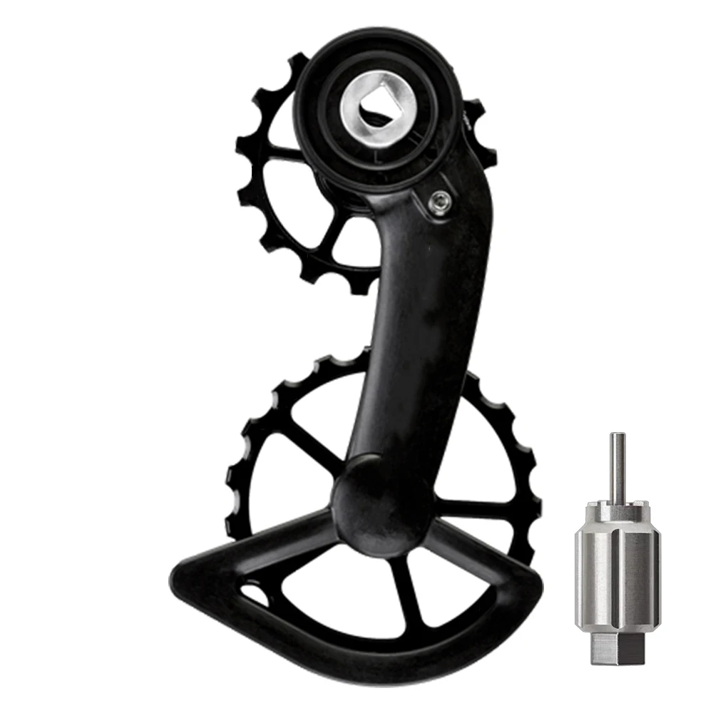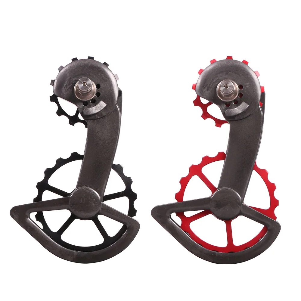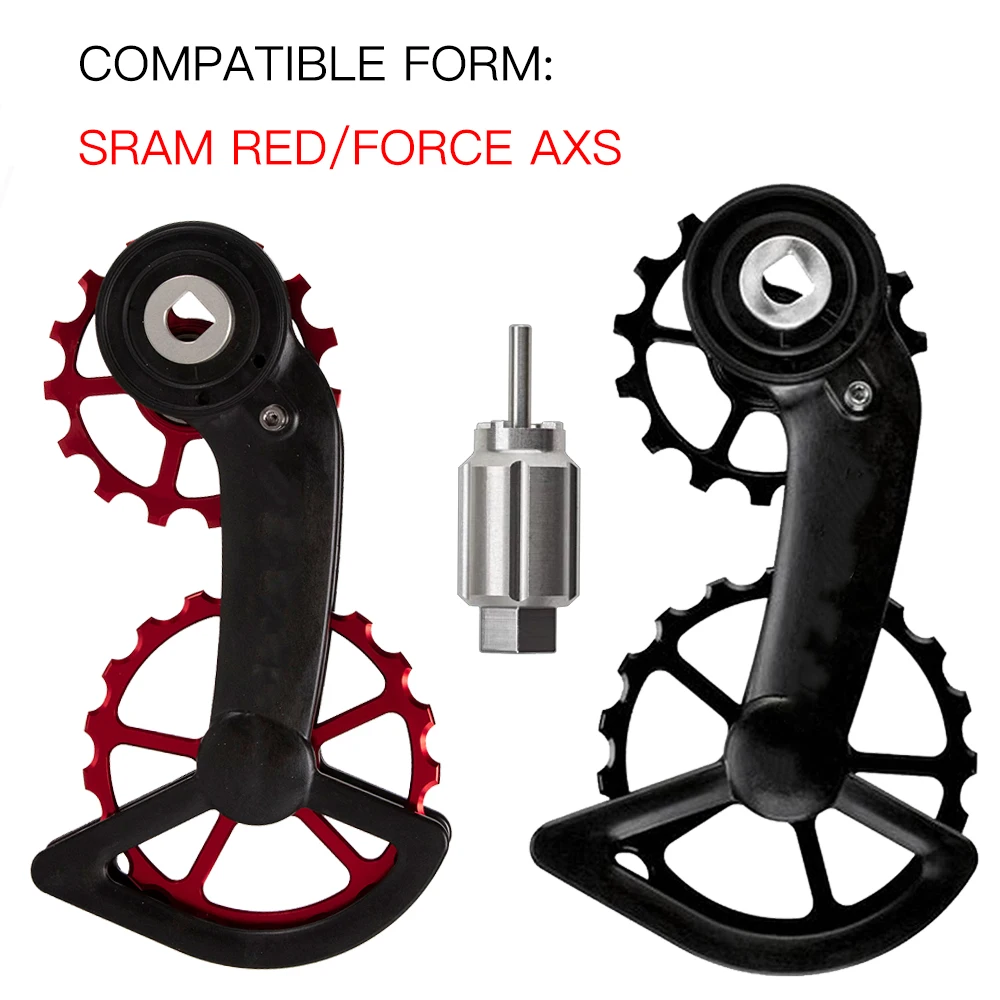 Объемный приводной ременный шкив Системы для SRAM красный и силу AXS имеет 15-зуб верхний и 19-зуб нижний приводной ременный шкив, для максимальной эффективности. Ручная система OSPW имеет два пружинных натяжения, что позволяет настроить на основе условий езды.