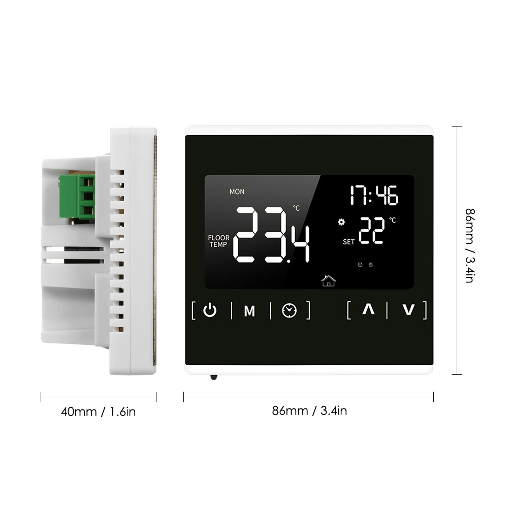 Этот цифровой термостат для напольного отопления использует передовое микрокомпьютерное управление чипом и высокоточный датчик для контроля температуры электрических нагревательных устройств. Управляйте моторизованным шаровым клапаном, моторизованным клапаном, тепловым клапаном, электромагнитным клапаном, нагревателем, электрической нагревательной пленкой и электронагревательным углеродным кристаллом. В основном используется для напольного отопления.Особенности:Термостат с подогревом сенсорного экрана, прост в установке и использовании и удобно вписывается в вашу жизнь.Программируйте его на основе вашего графика, чтобы сократить ваши счета за электричество. Гибкие программируемые сроки: 5-2 дня или 6-1 день.В состоянии выключения, функция анти-замерзания при низкой температуре будет автоматически включаться, когда он будет ниже 5 ℃; И защита от перегрева начнется, когда он будет более 7 ℃ для защиты пола.Ручной режим и программируемый режим можно выбрать с 3 метровым внешним датчиком.6 режимов программируемой функции для контроля температуры и времени. Доступны часы и минуты.Функция блокировки клавиатуры для предотвращения неправильного использования детьми.Функция памяти при отключении питания Защитите настройки от сбоя питания.Характеристики:Цвет: черный/белый (по желанию)Материал: Огнестойкий поликарбонат + АБС-пластикВходная частота: 60 ГцВходное напряжение: 85-250 В переменного токаДатчик температуры: термометр NTCТочность контроля температуры: ± 1 ℃Потребляемая мощность: <1 ВтТок нагрузки: 16AКлюч: сенсорное управлениеНастройка температуры: от 5 до 50 ℃Диапазон измерения температуры: -9 ℃ ~ 99 ℃Дисплей: 71*40 мм ЖК-дисплейРасстояние между установленными отверстиями: 60 ммПодходящий Размер коробки: 86*86 ммРазмер изделия: прибл. 86*86*45 мм/3,4*3,4 * 1.77inВес изделия: прибл. 135g/4,8 ozРазмер посылка: прибл. 10,4*10*8 см/4,1*3,9 * 3.1inВес посылка: прибл. 277 г/9,8 унцийУпаковочный лист:1 * термостат для подогрева пола1*3 метра кабель внешнего датчика2 * крепежные винты1 * Руководство пользователя (на английском и русском языках)Примечание:Для установки термостата необходимо подготовить распределительную коробку на стене, подходящий размер 86*86 мм. И расстояние установки 60 мм.