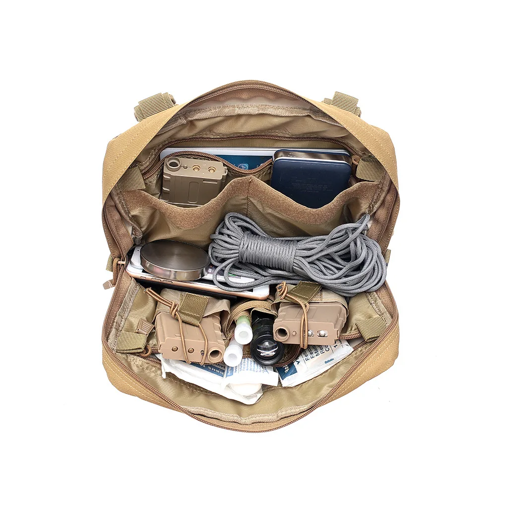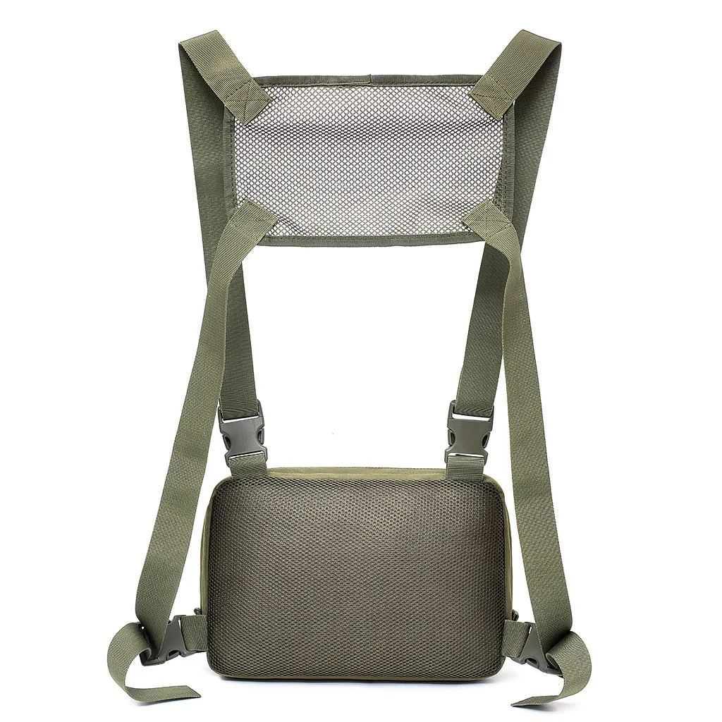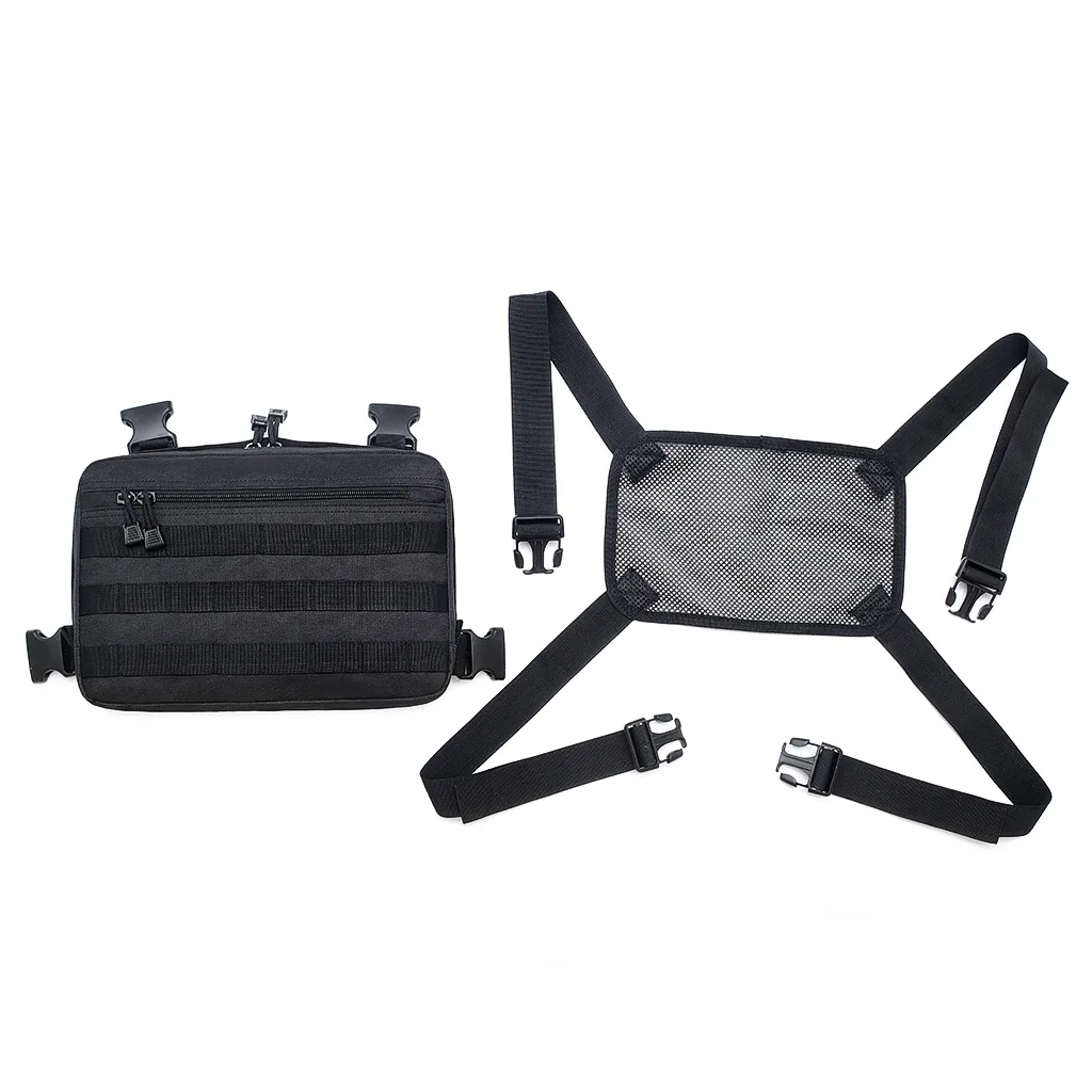 -- 600D нейлоновая ткань, водонепроницаемая и прочная. -Регулируемые двойные плечевые ремни, идеально подходят для вашего тела. -Передняя часть сумки имеет 3 лямки molle, которые вы можете прикрепить к сумке или другим аксессуарам. -Задняя часть сумки и задняя часть имеют сетку, которая удобна и воздухопроницаема. -Богатые отсеки, вы можете легко классифицировать ваши инструменты. -Дизайн, используемый в передней части груди, безопасен и не теряется.
