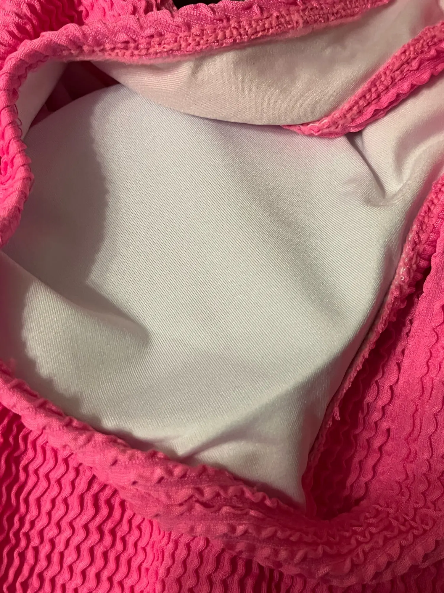 Бомбический купальник!!! Очень понравился) А если Вы ещё обладательница красивой зоны декольте , то купальник будет смотреться божественно Есть чашечки, при желании можно вынуть Мои параметры: 84-66-95 и рост 172 см. Купальник в размере S сел отлично. Но по росту девушкам выше не стала бы рекомендовать Выполнен из жатого материала