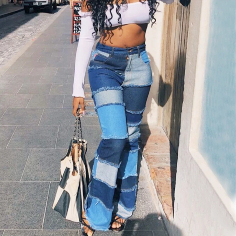 Женские джинсы в стиле колокол, модные двухцветные джинсы в стиле п...