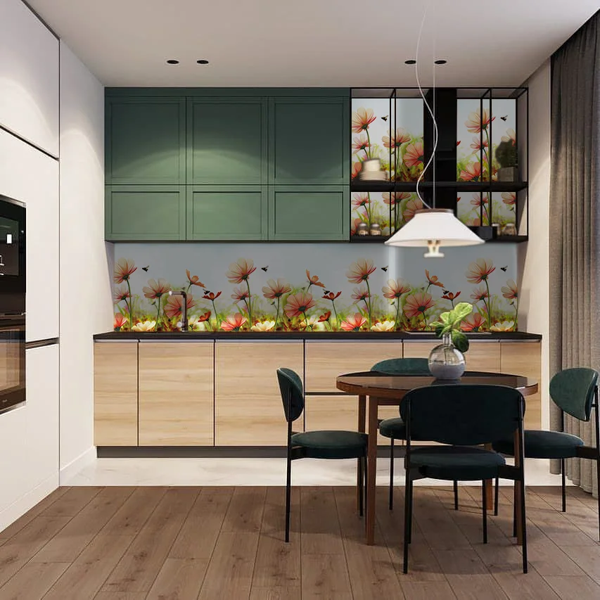 Кухонный фартук для пространства междунавесными шкафами, плитой и столешницейне просто защищает стены от влаги,копоти и загрязнений, но и придаеткухне воздушность, наполняет новымикрасками.Для его монтажа не требуетсядлительная подготовка и выравниваниестен. С его помощью можно быстро скрытьшероховатости и другие недостаткинастенной поверхности, а также придатьнеповторимую элегантность интерьеру.
