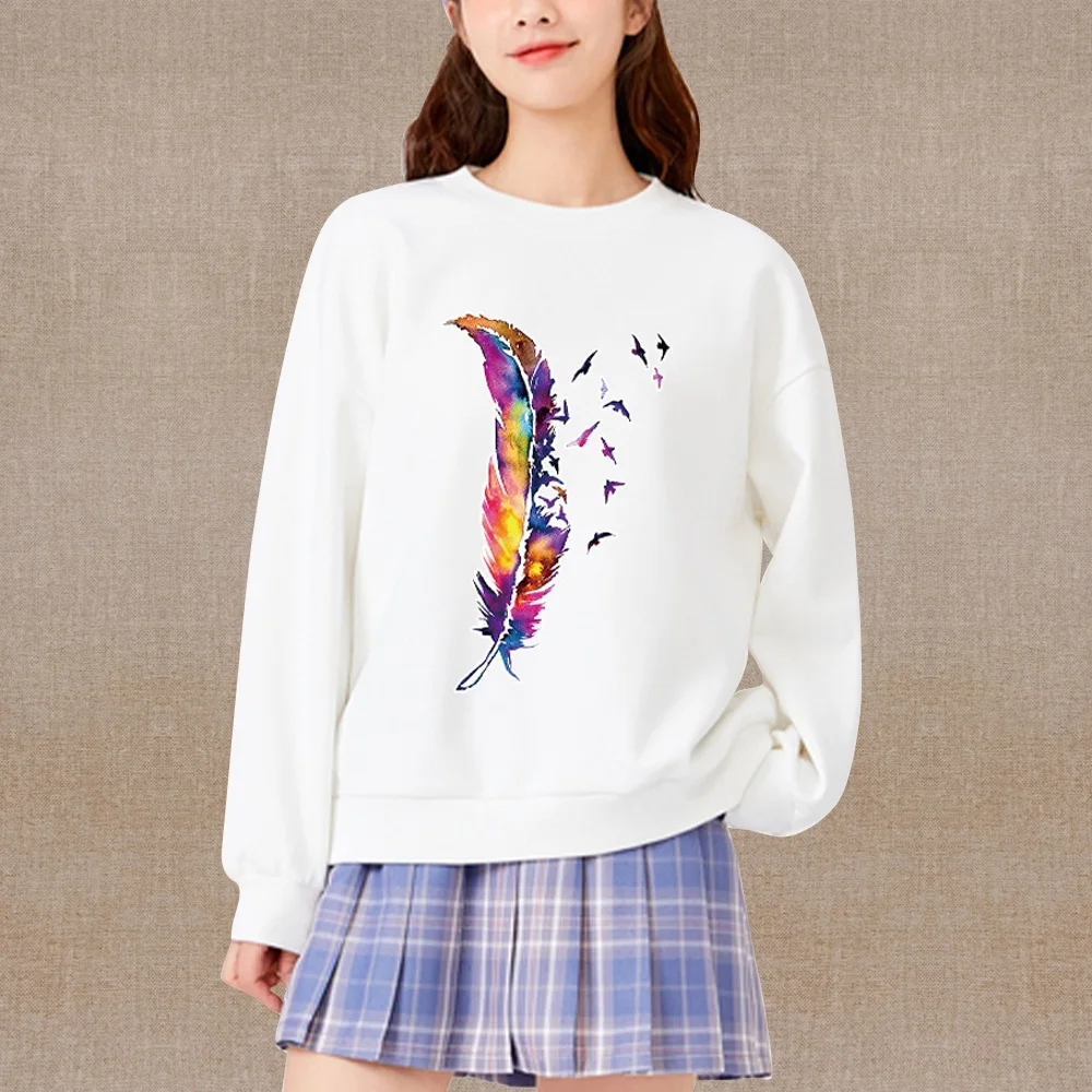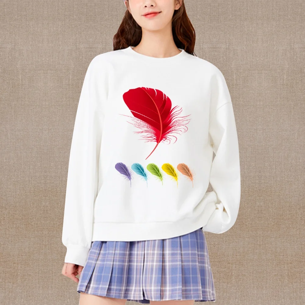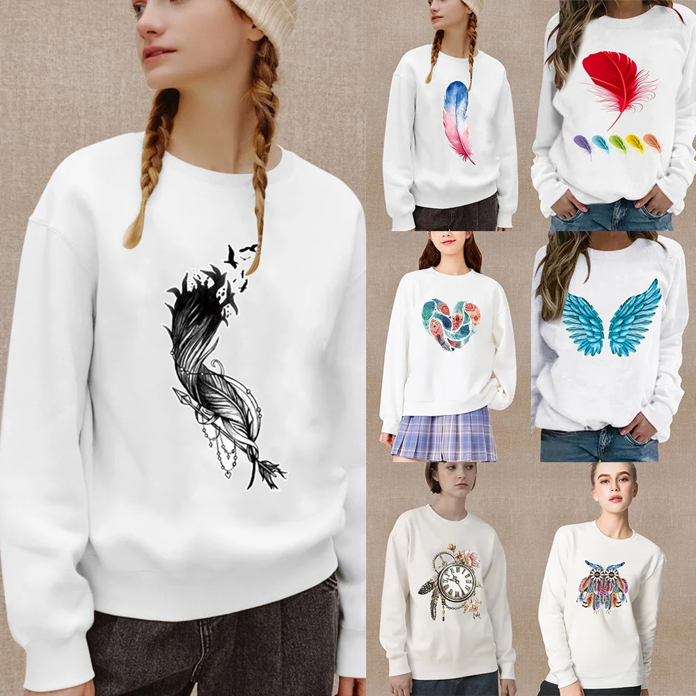 Женская толстовка с длинным рукавом, модный белый пуловер, серия с принтом цветных перьев и круглым вырезом, повседневная Осенняя теплая мягкая толстовка